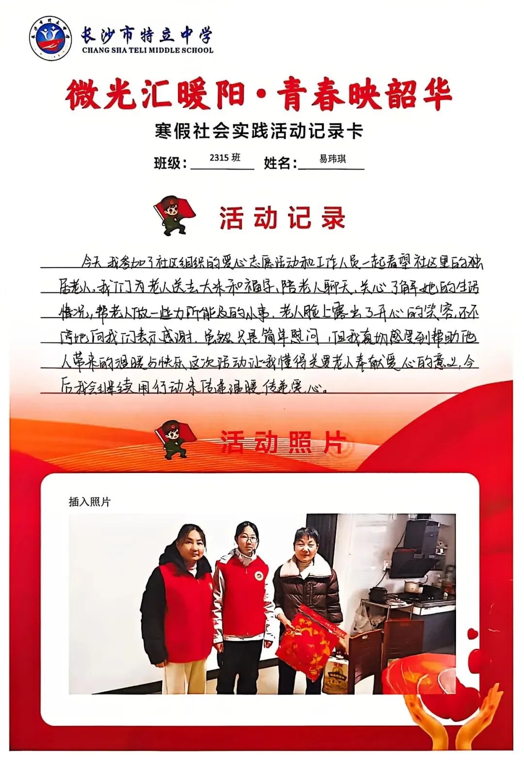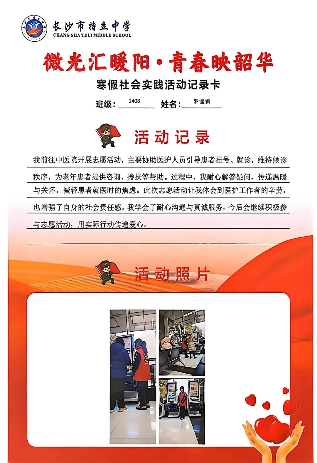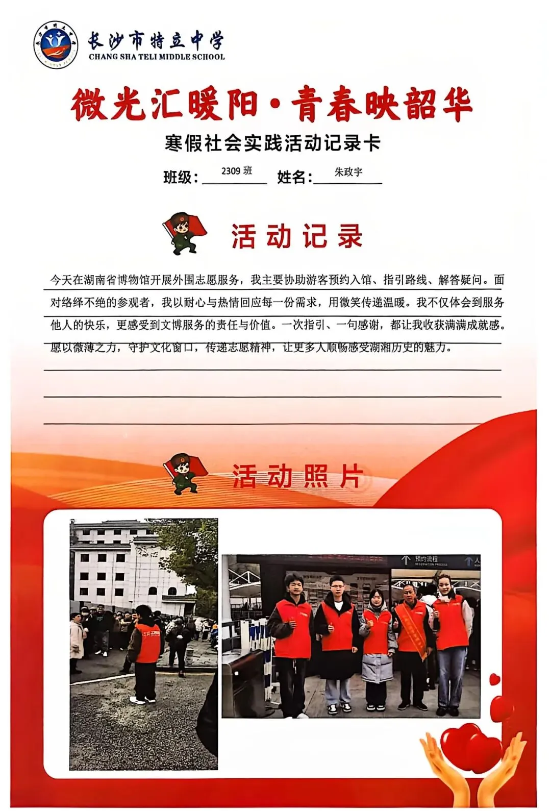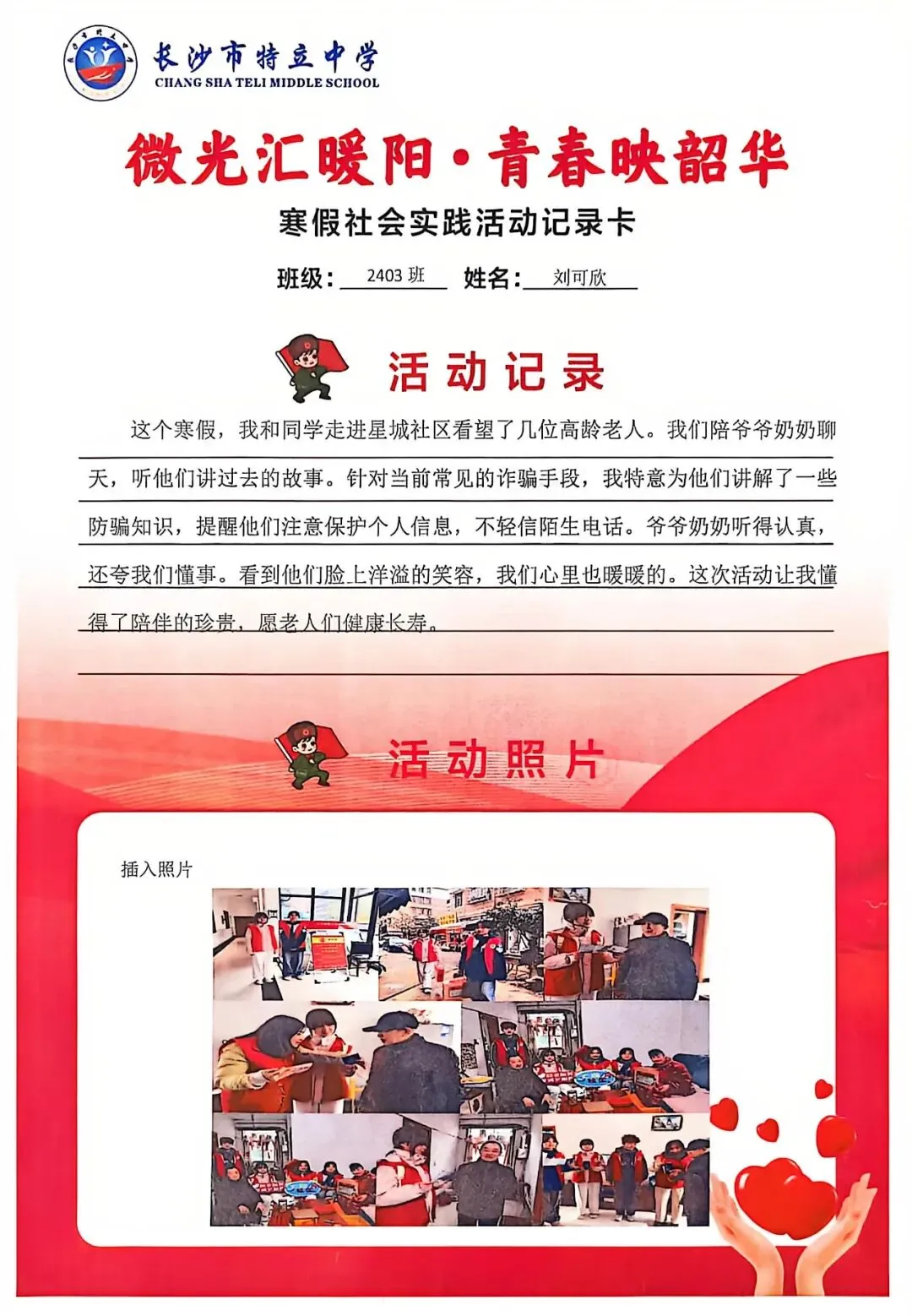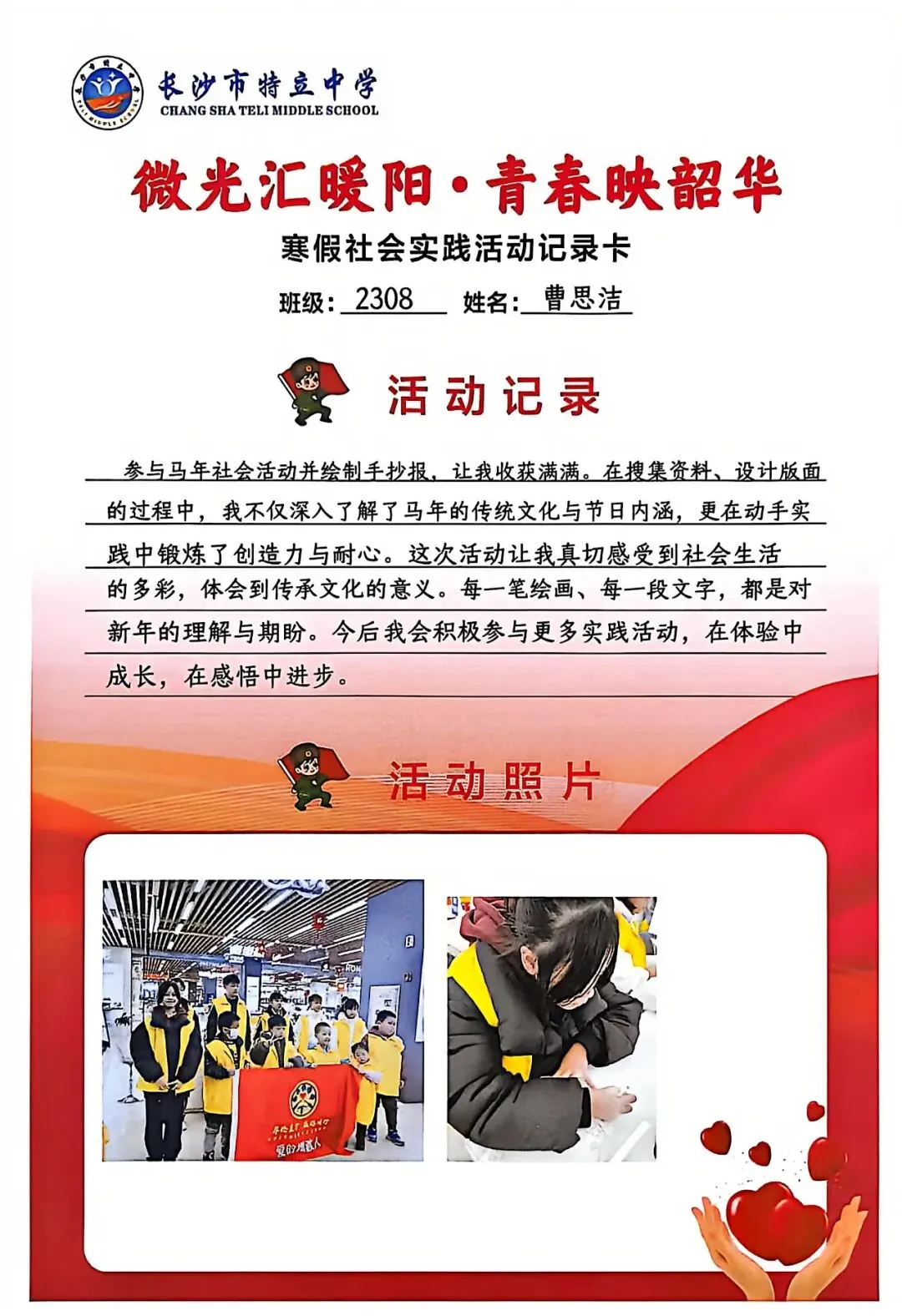 一张张社会实践活动记录卡,定格下少年们无私奉献的瞬间,一段段真挚感悟诉说着成长与收获。同学们在志愿服务中,体会到帮助他人的快乐,学会了耐心沟通与真诚付出,更懂得了责任与担当,用点点微光汇聚成冬日暖阳,践行着雷锋精神,让青春在奉献中绽放光彩。