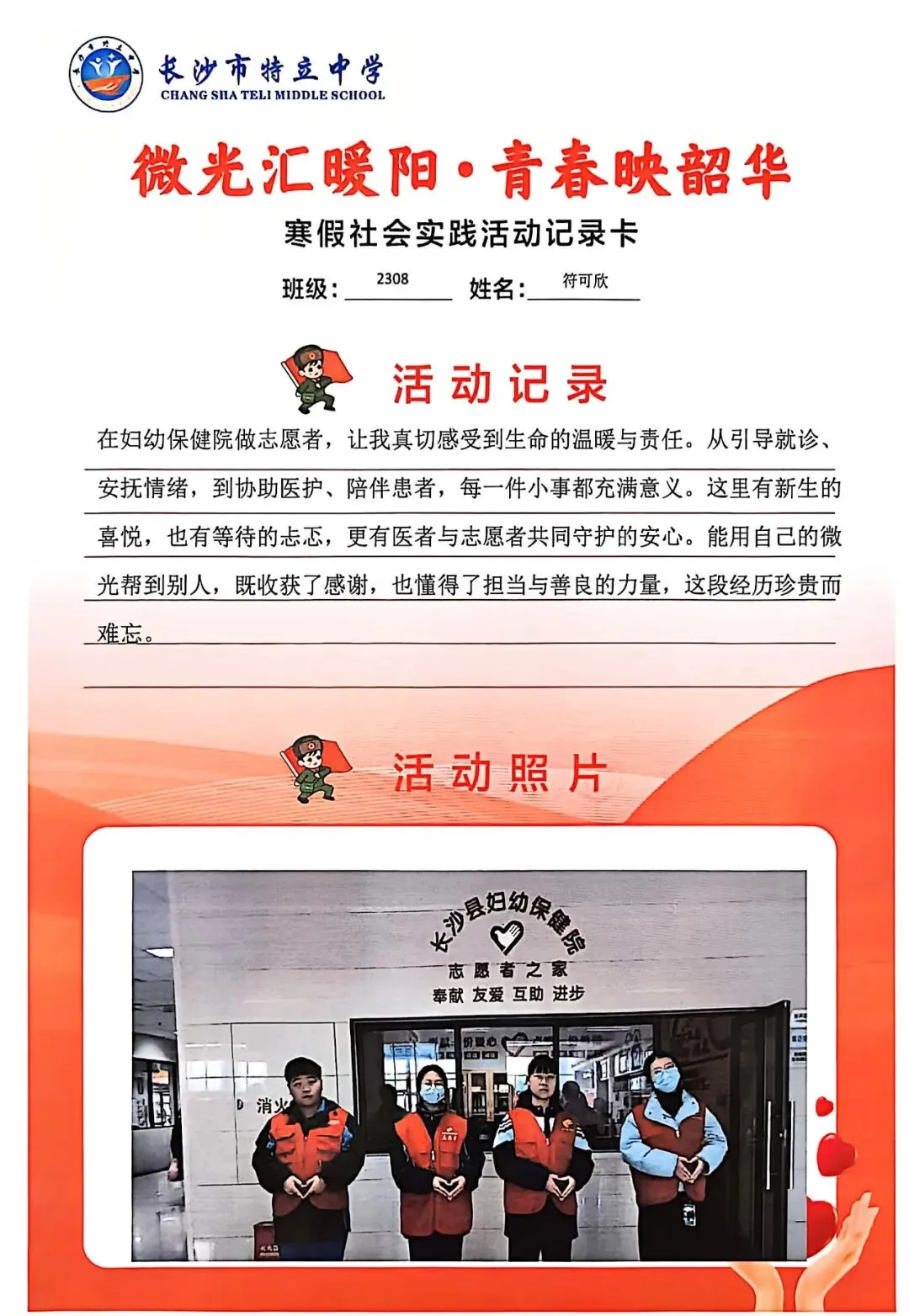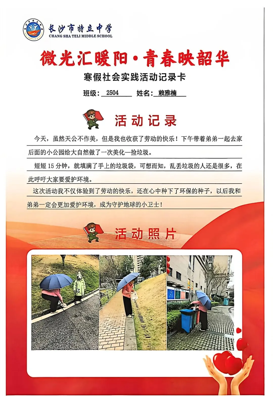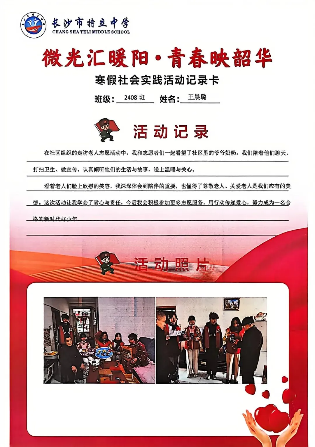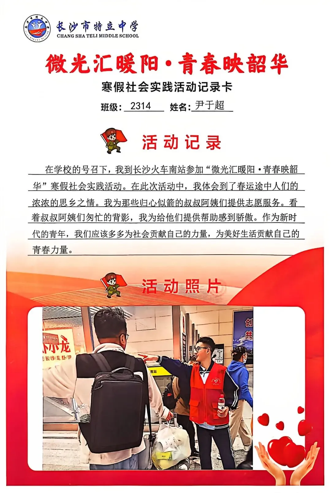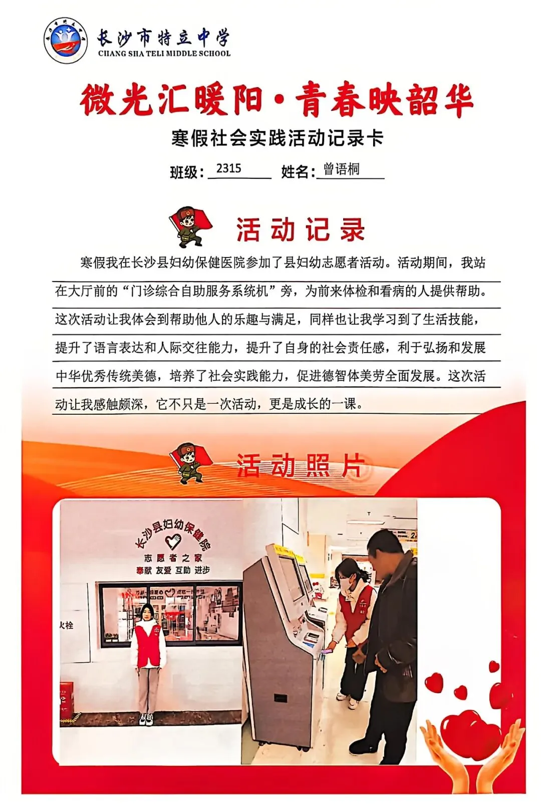 一张张社会实践活动记录卡,定格下少年们无私奉献的瞬间,一段段真挚感悟诉说着成长与收获。同学们在志愿服务中,体会到帮助他人的快乐,学会了耐心沟通与真诚付出,更懂得了责任与担当,用点点微光汇聚成冬日暖阳,践行着雷锋精神,让青春在奉献中绽放光彩。