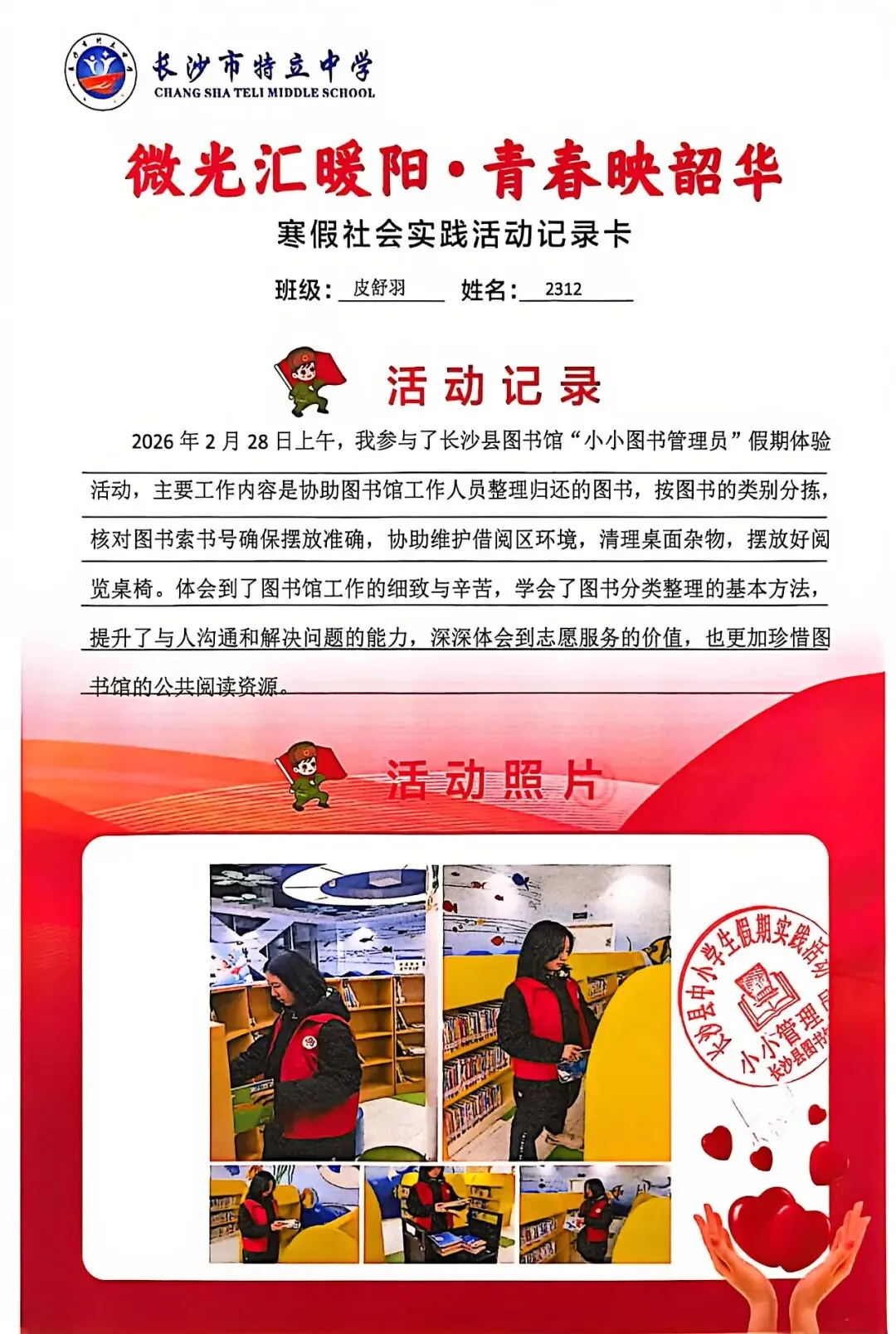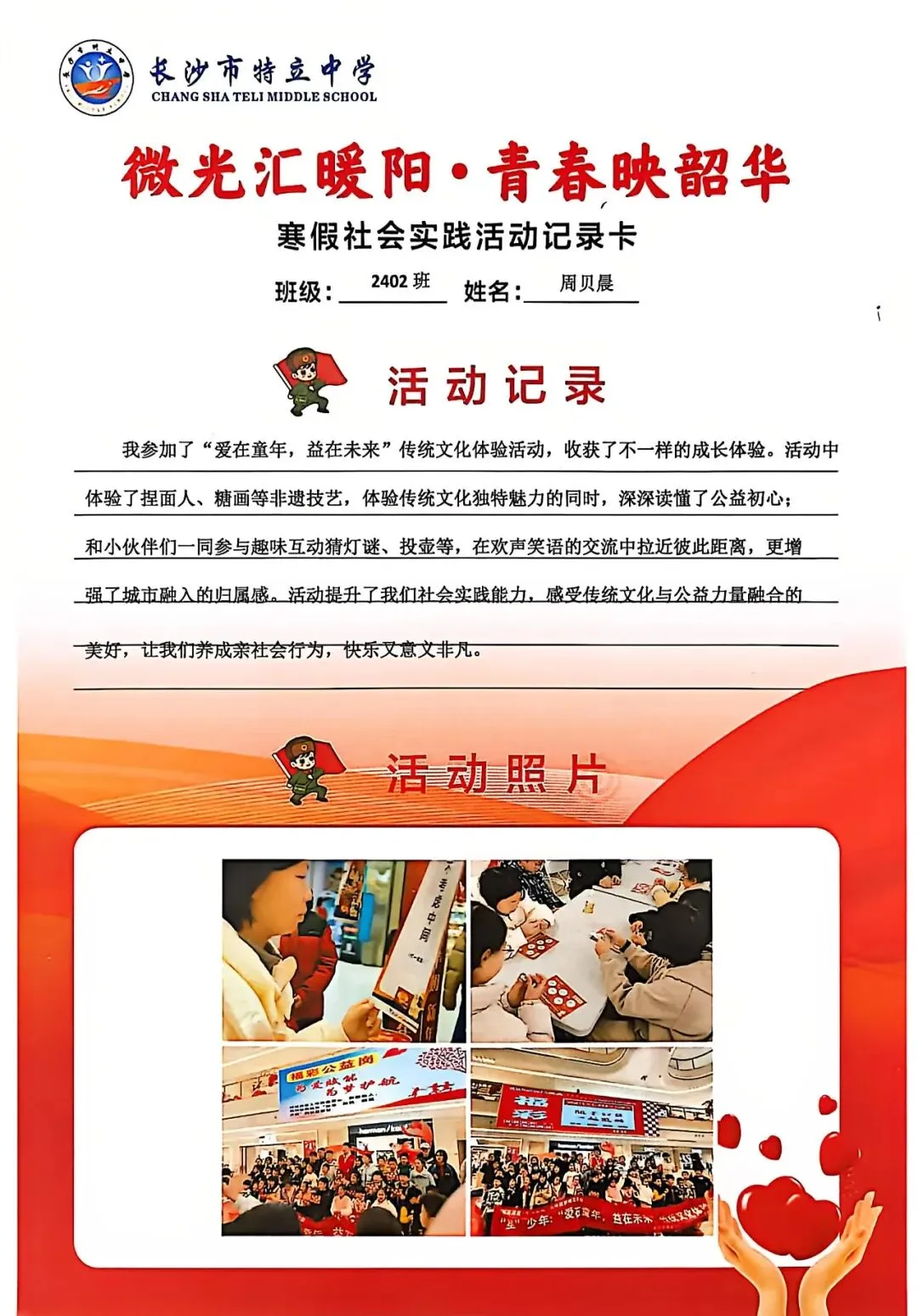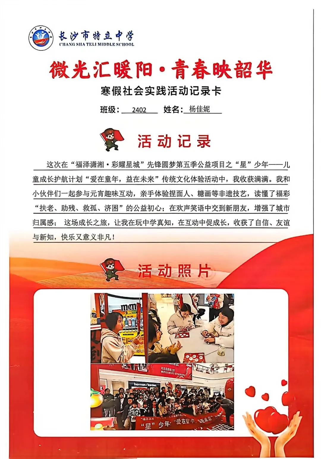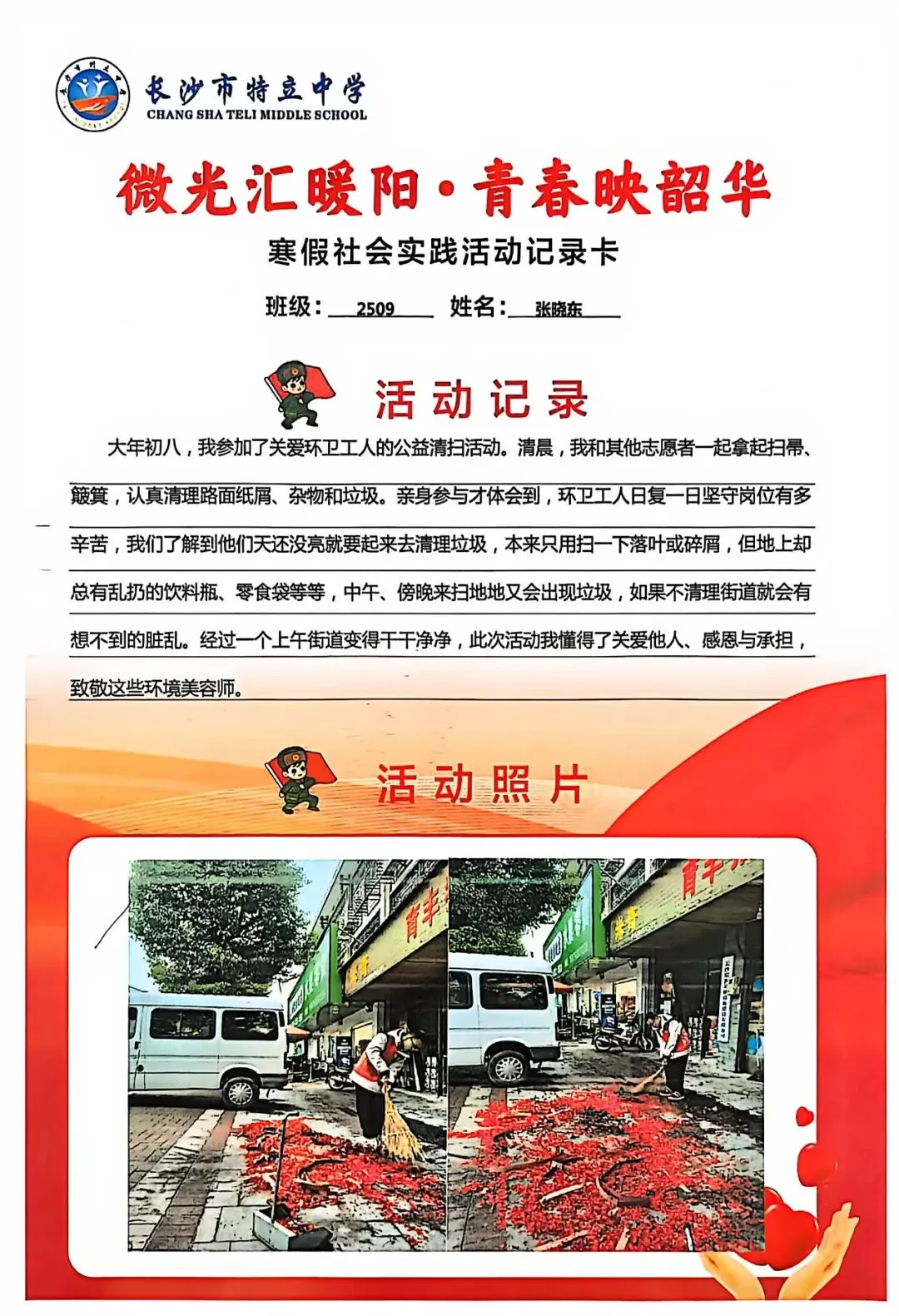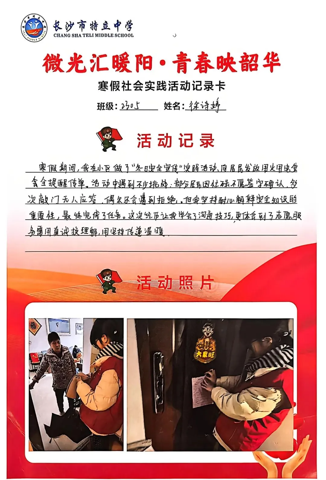 一张张社会实践活动记录卡,定格下少年们无私奉献的瞬间,一段段真挚感悟诉说着成长与收获。同学们在志愿服务中,体会到帮助他人的快乐,学会了耐心沟通与真诚付出,更懂得了责任与担当,用点点微光汇聚成冬日暖阳,践行着雷锋精神,让青春在奉献中绽放光彩。
