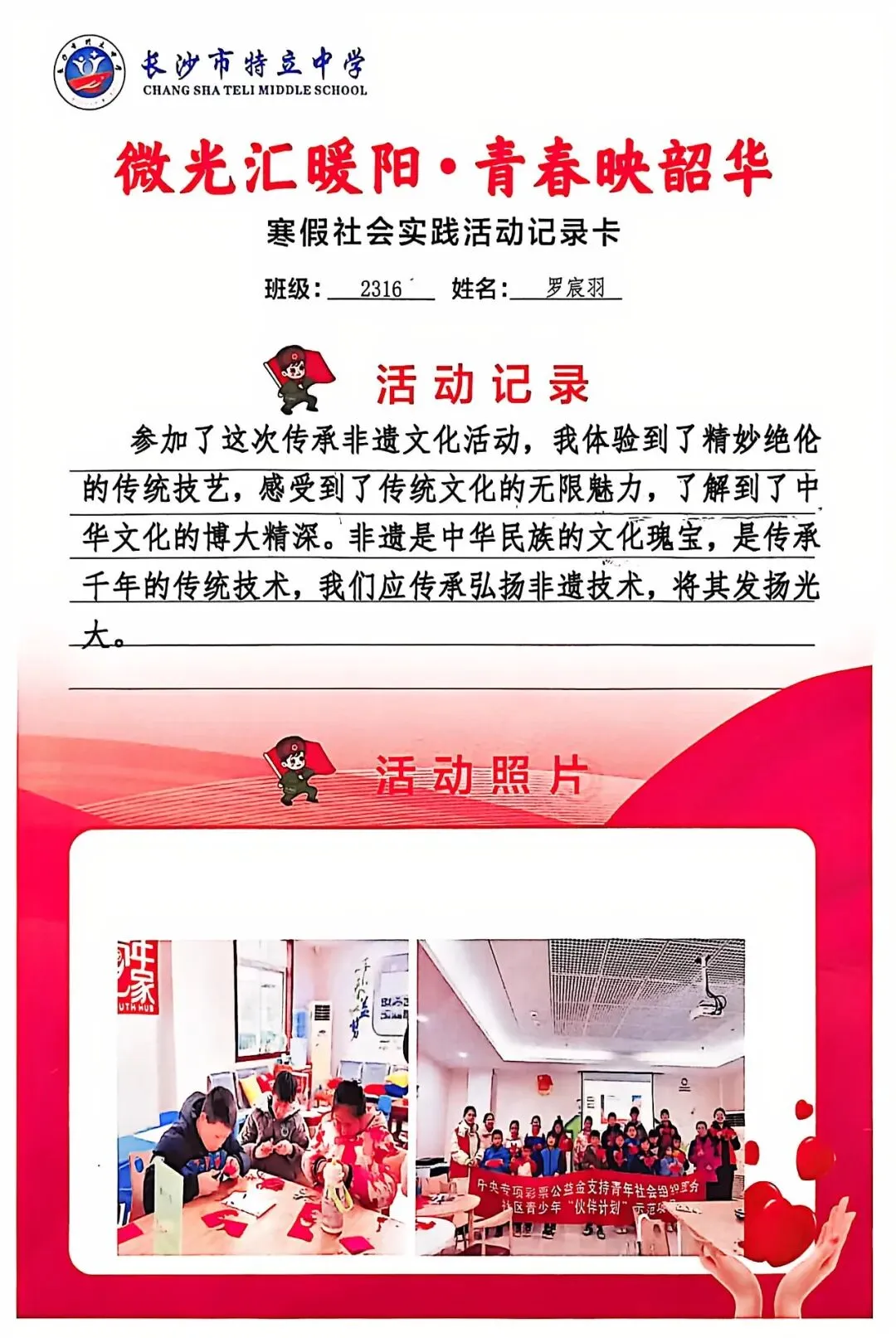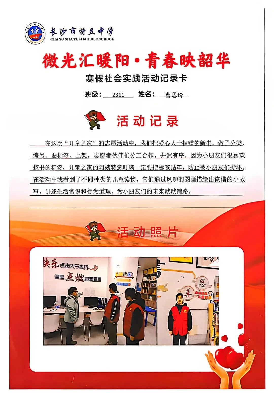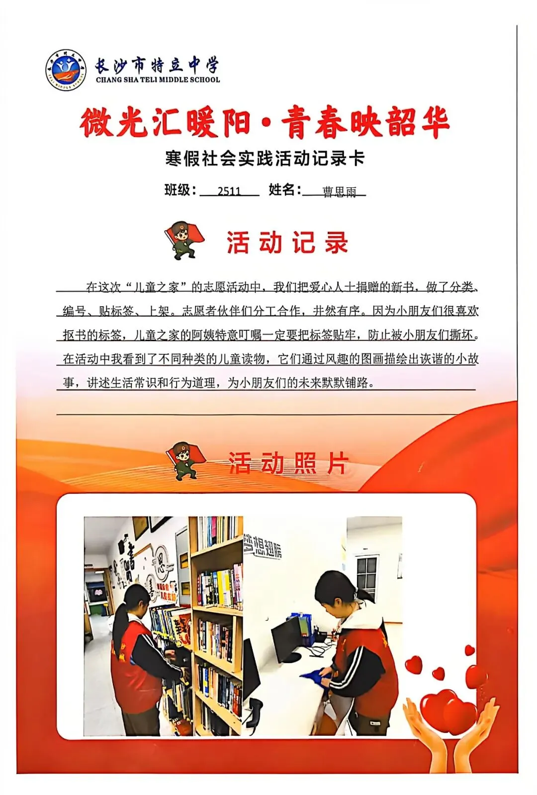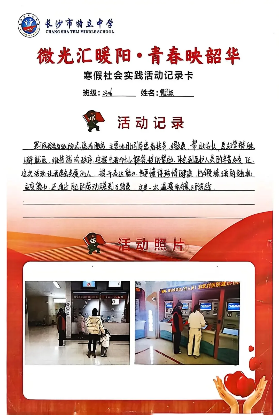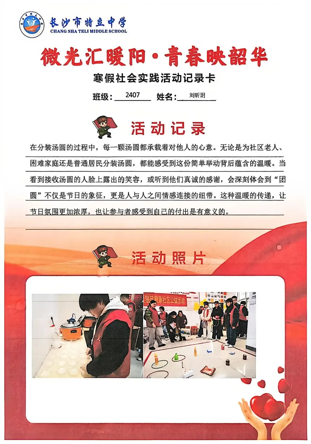一张张社会实践活动记录卡,定格下少年们无私奉献的瞬间,一段段真挚感悟诉说着成长与收获。同学们在志愿服务中,体会到帮助他人的快乐,学会了耐心沟通与真诚付出,更懂得了责任与担当,用点点微光汇聚成冬日暖阳,践行着雷锋精神,让青春在奉献中绽放光彩。