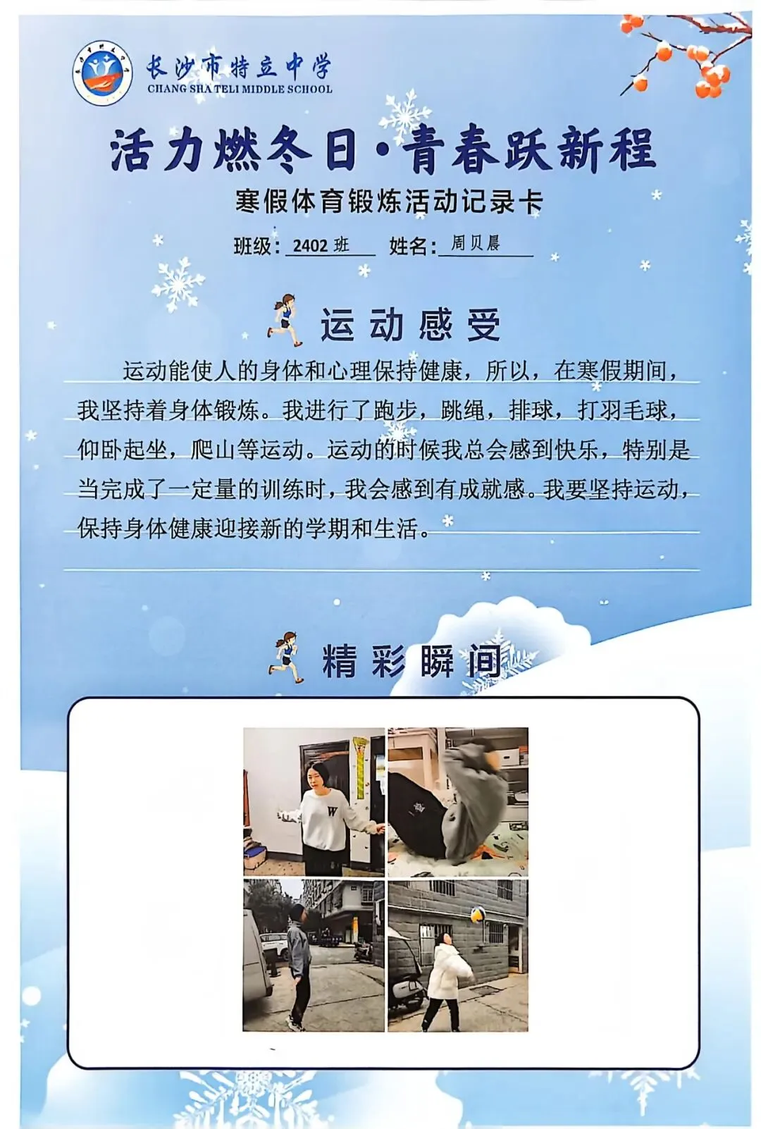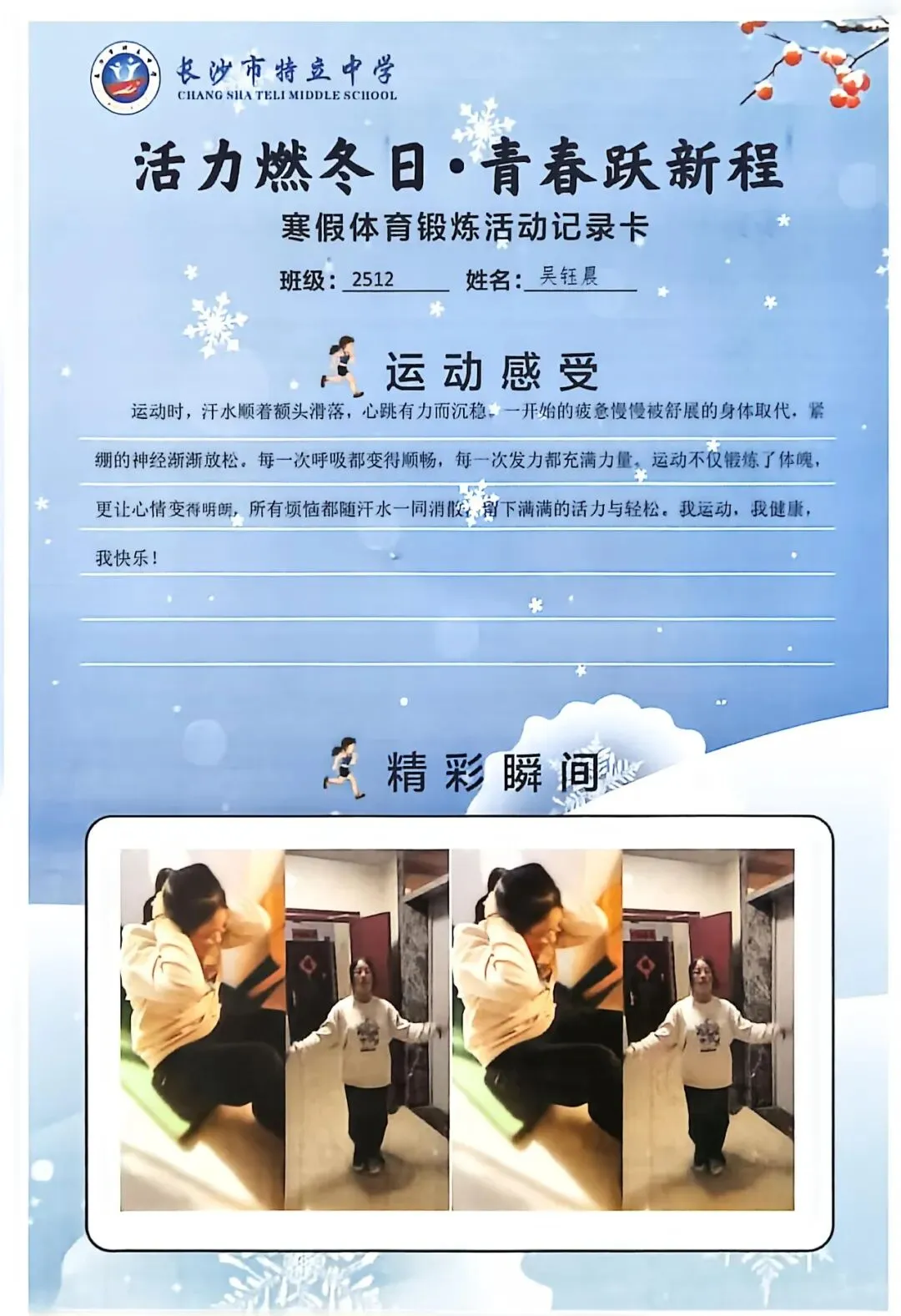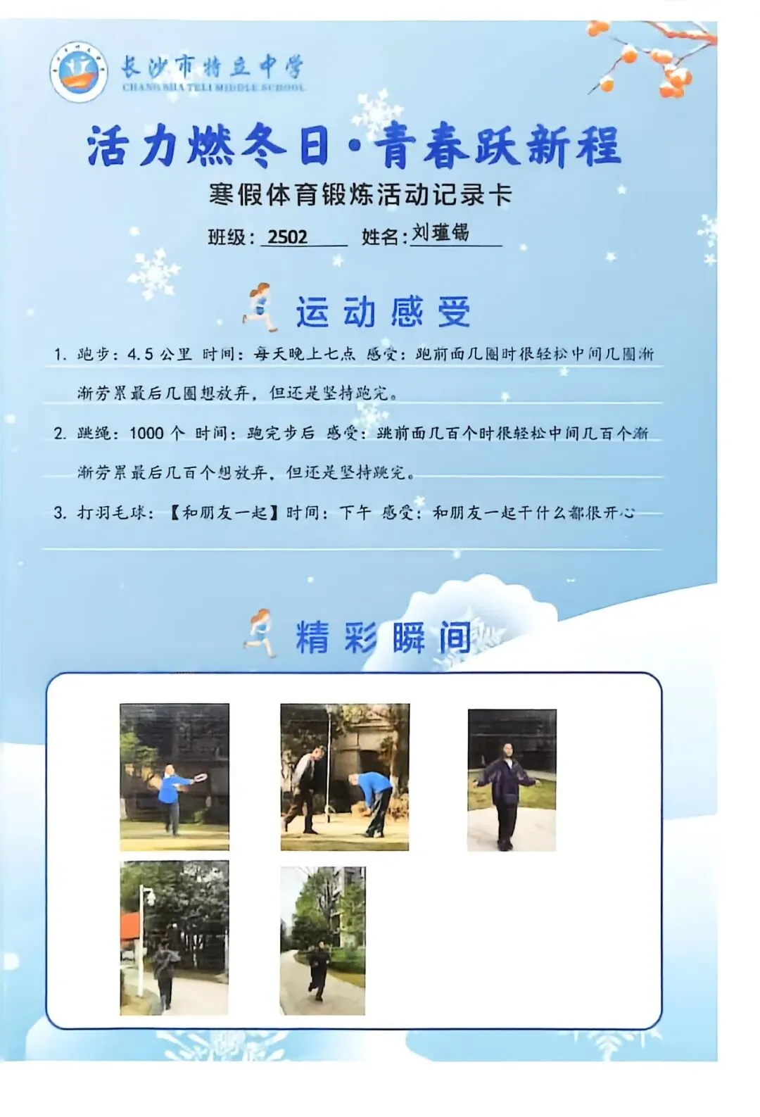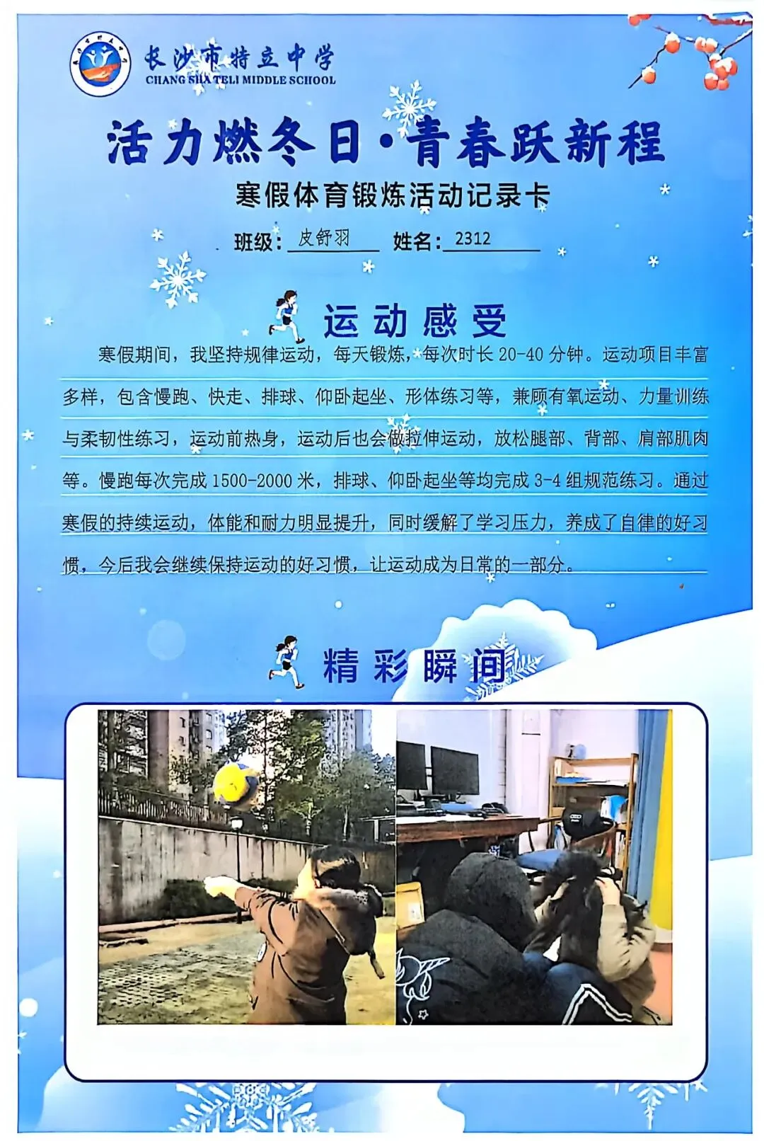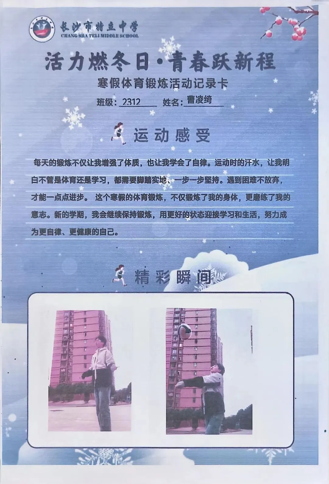 一张张体育锻炼活动记录卡,成为成长的最好见证:运动感受里,有从气喘吁吁到轻松坚持的突破,有从生疏笨拙到熟练掌握的进步,更有在坚持中收获的自律与自信;精彩瞬间中,有挥拍击球的飒爽,有跳跃奔跑的灵动,有亲子运动的温馨。