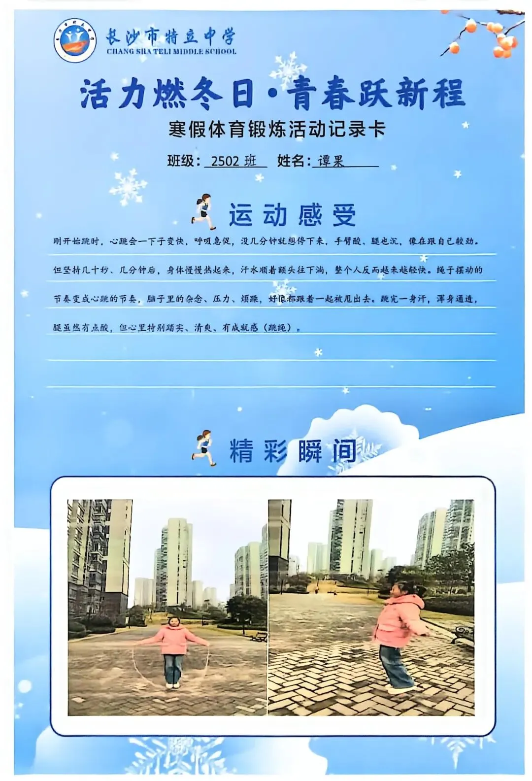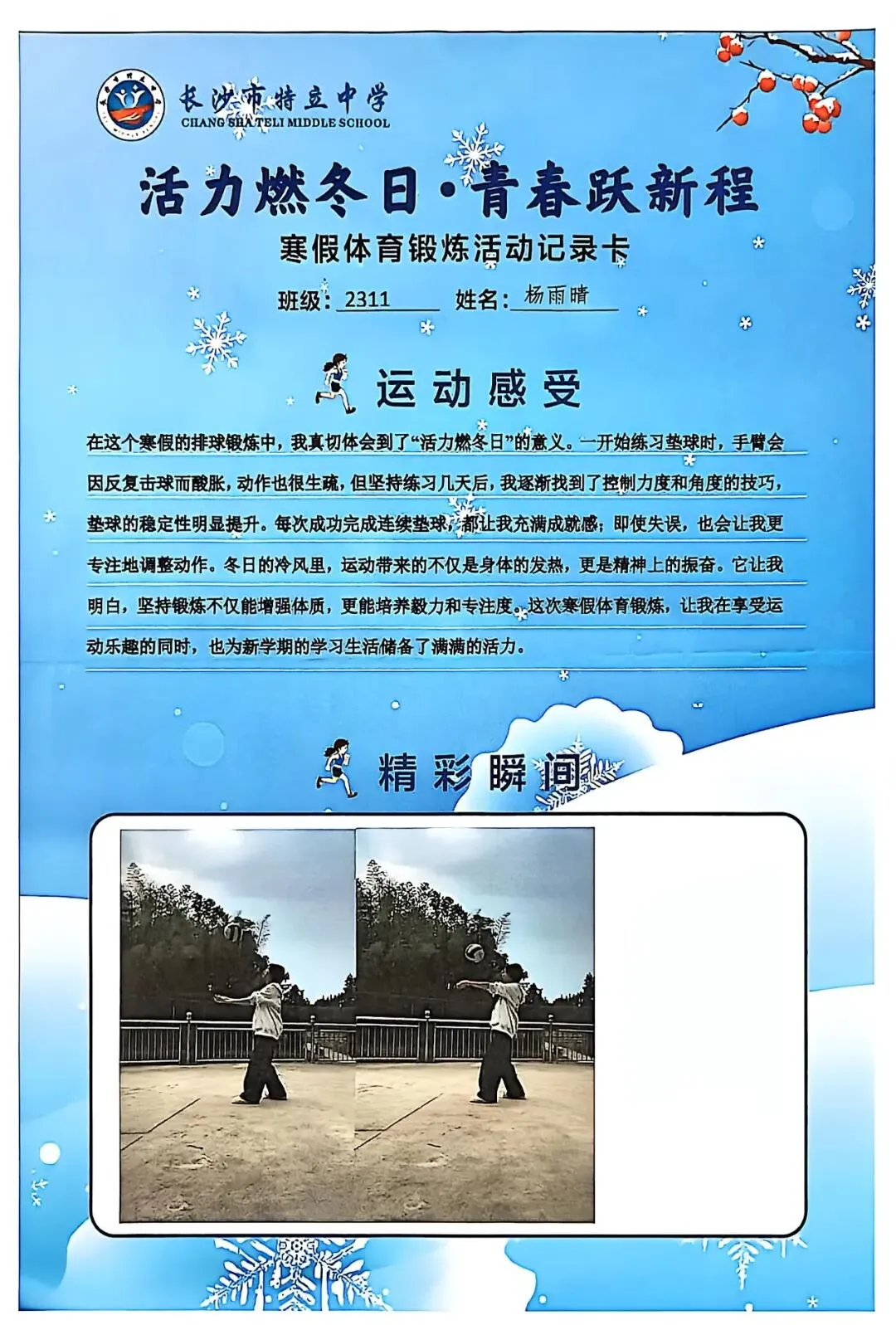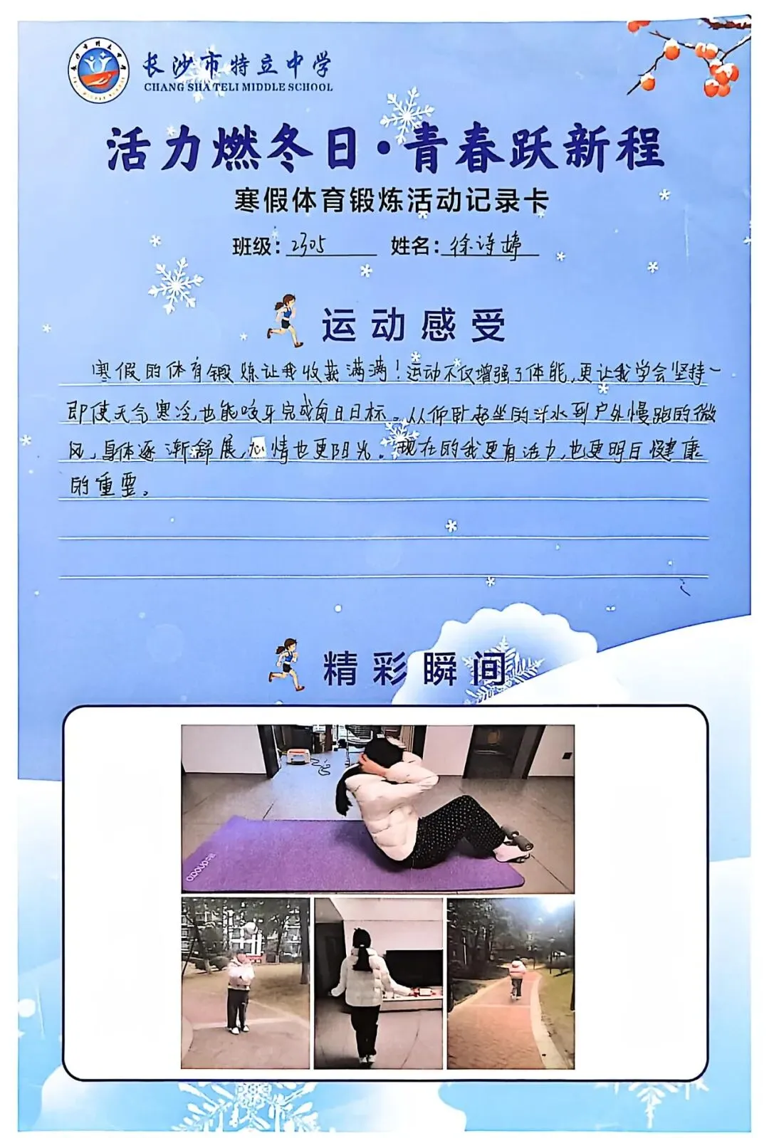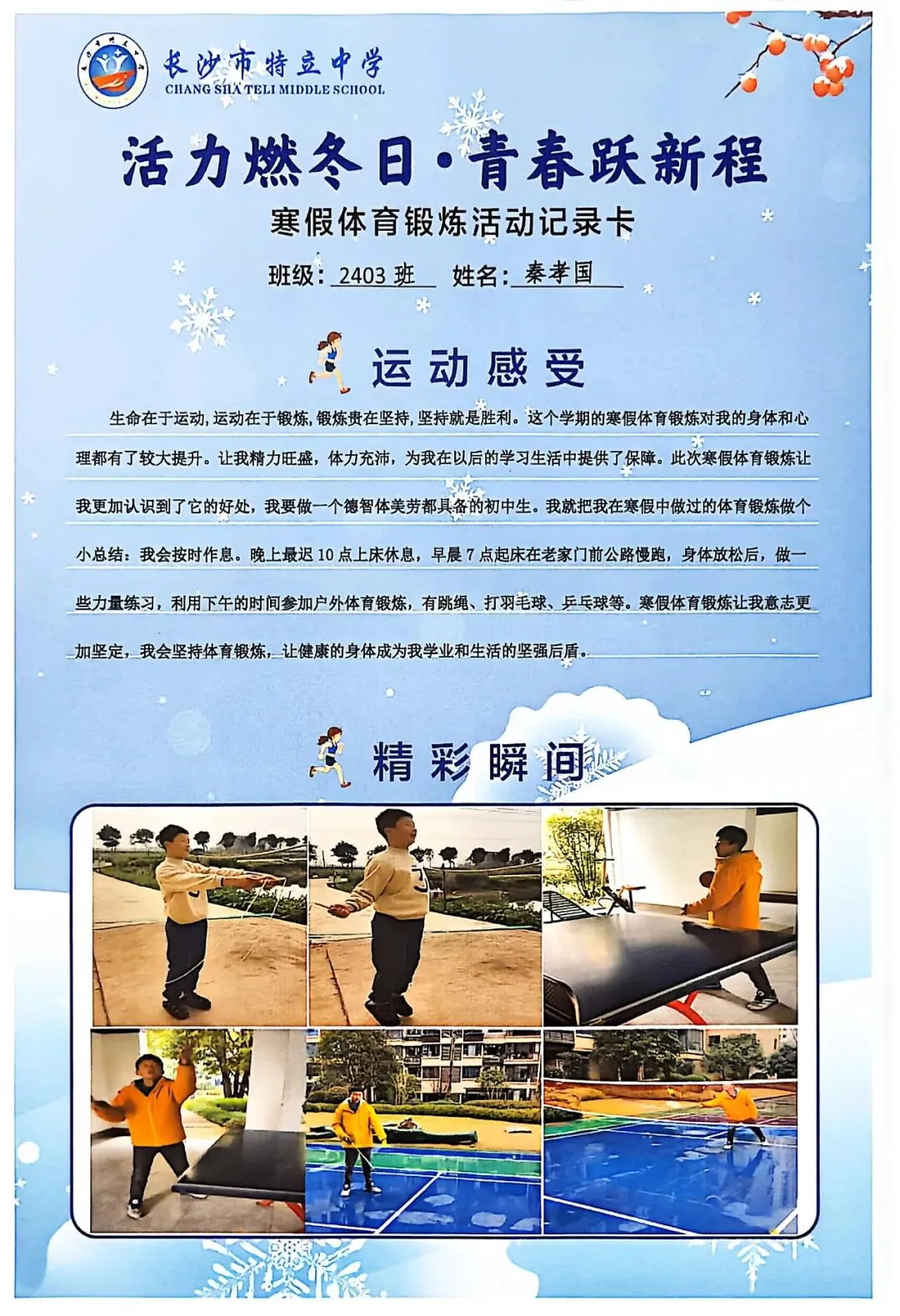 一张张体育锻炼活动记录卡,成为成长的最好见证:运动感受里,有从气喘吁吁到轻松坚持的突破,有从生疏笨拙到熟练掌握的进步,更有在坚持中收获的自律与自信;精彩瞬间中,有挥拍击球的飒爽,有跳跃奔跑的灵动,有亲子运动的温馨。