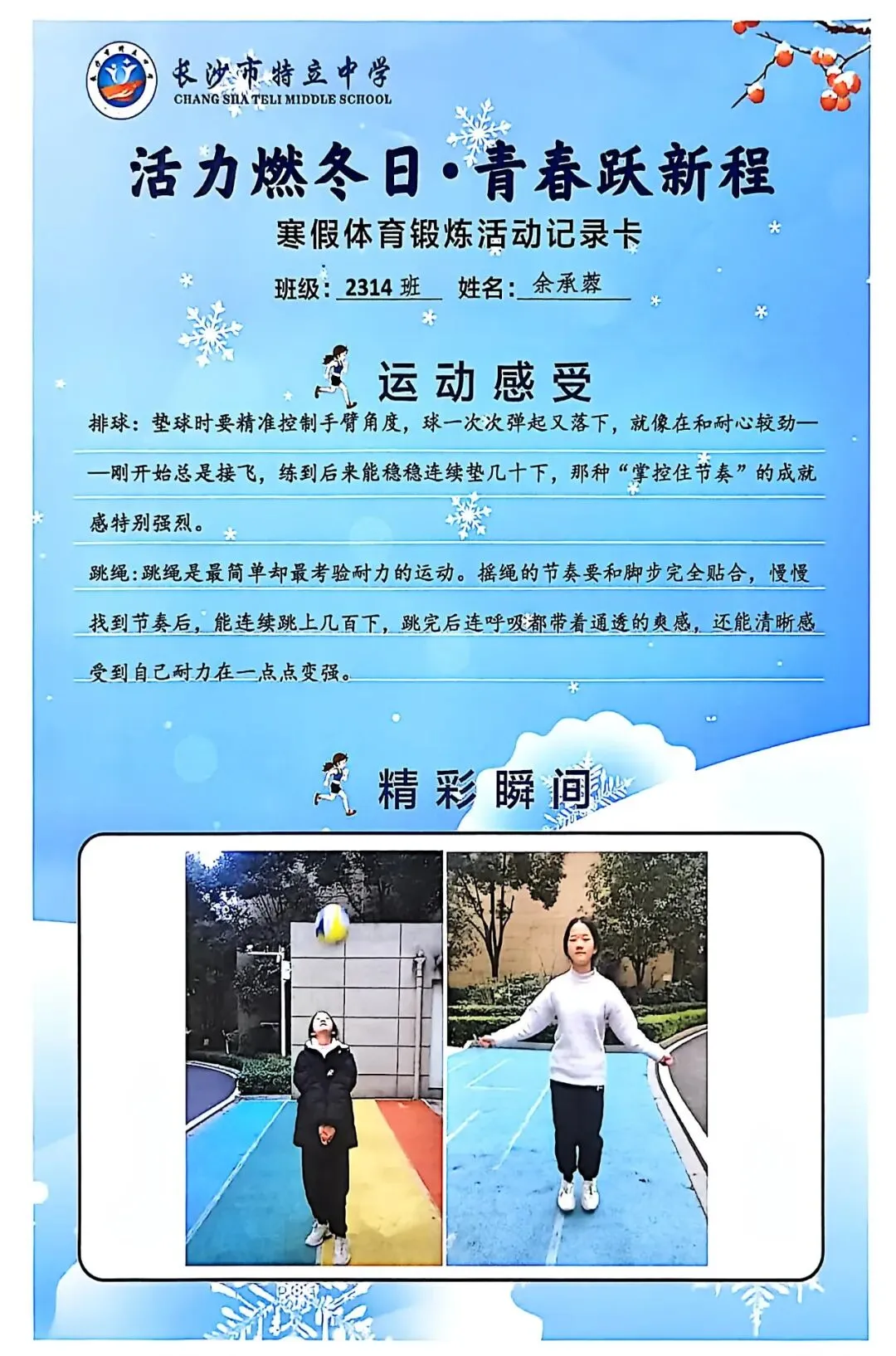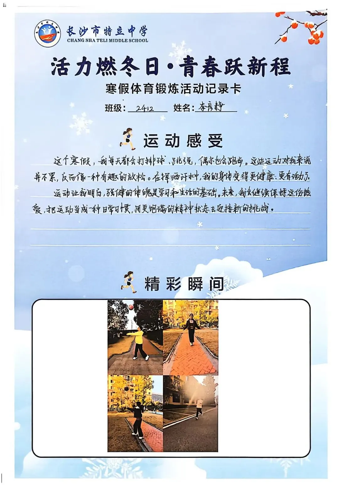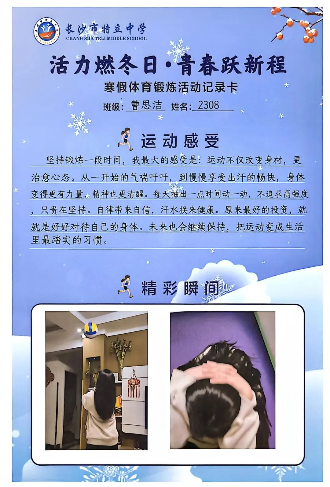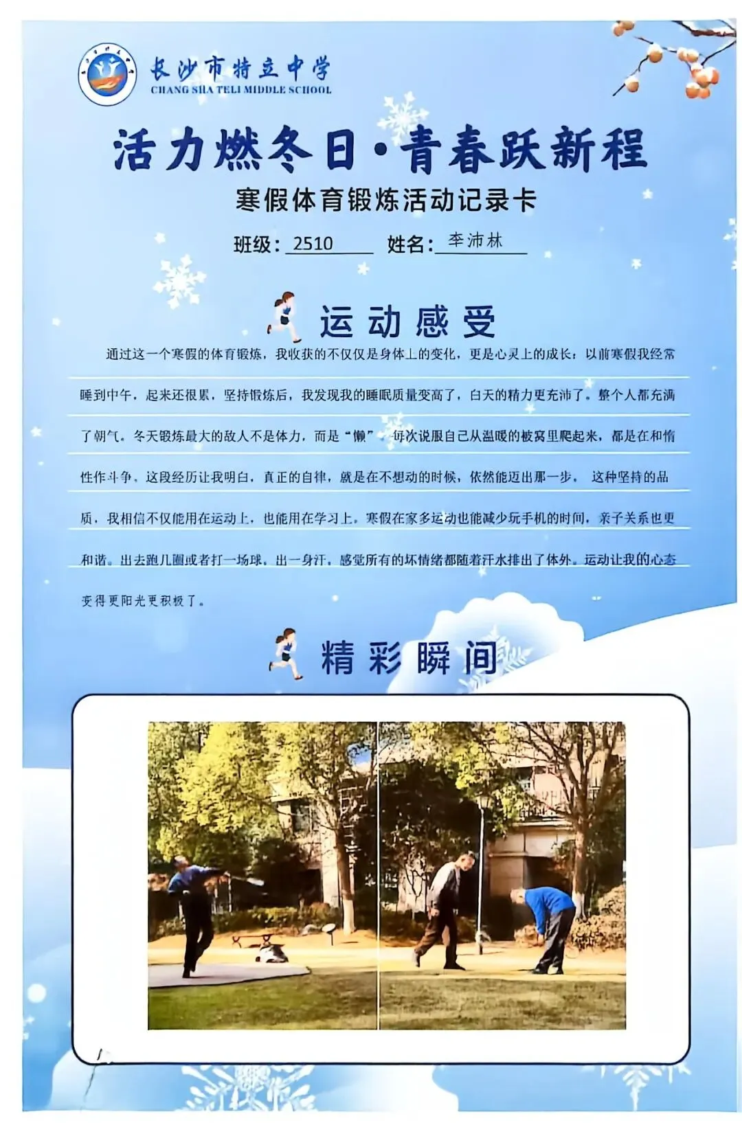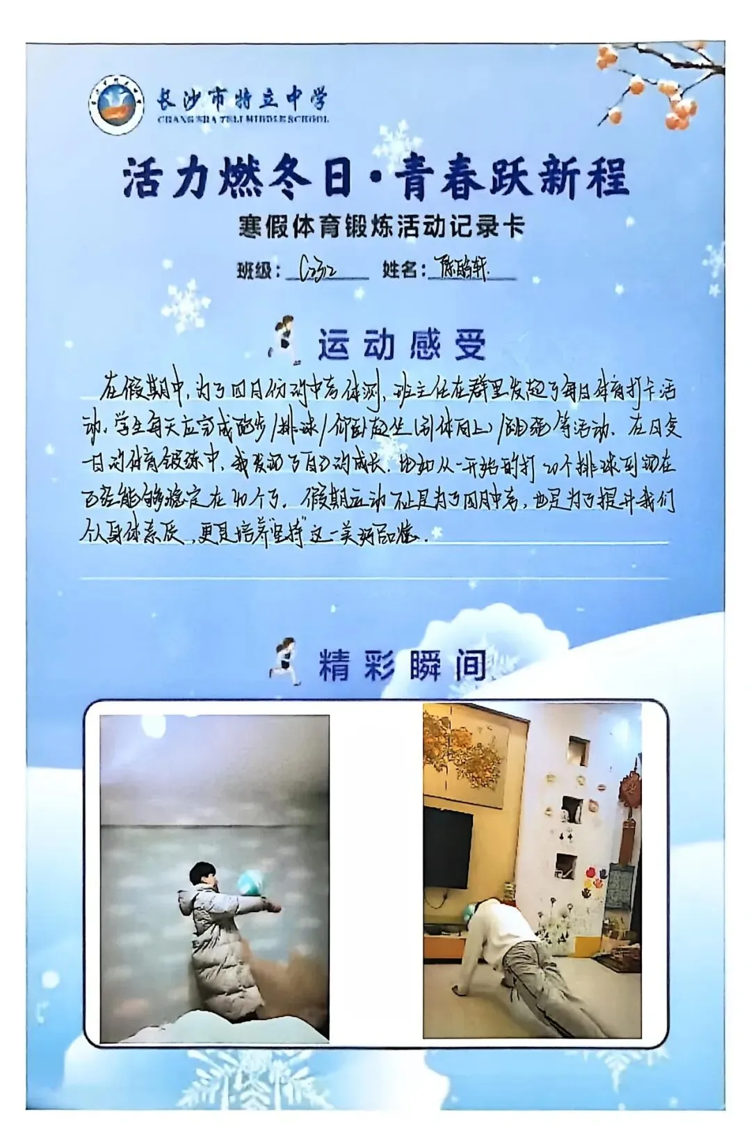 一张张体育锻炼活动记录卡,成为成长的最好见证:运动感受里,有从气喘吁吁到轻松坚持的突破,有从生疏笨拙到熟练掌握的进步,更有在坚持中收获的自律与自信;精彩瞬间中,有挥拍击球的飒爽,有跳跃奔跑的灵动,有亲子运动的温馨。