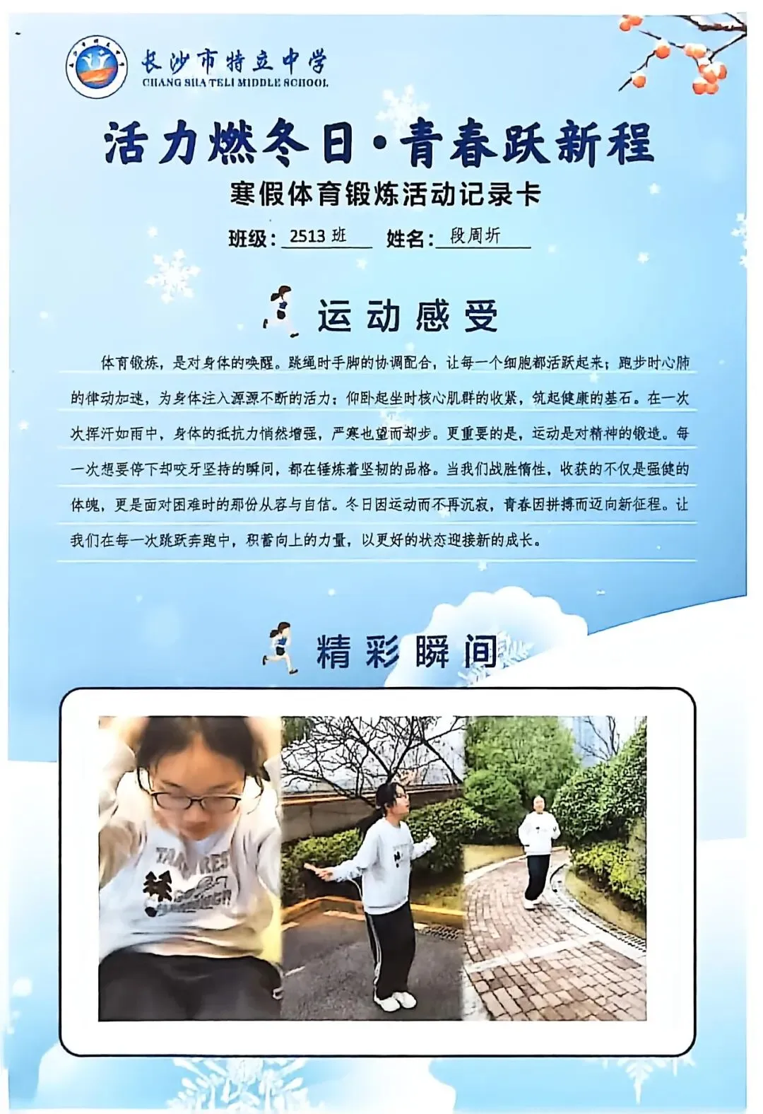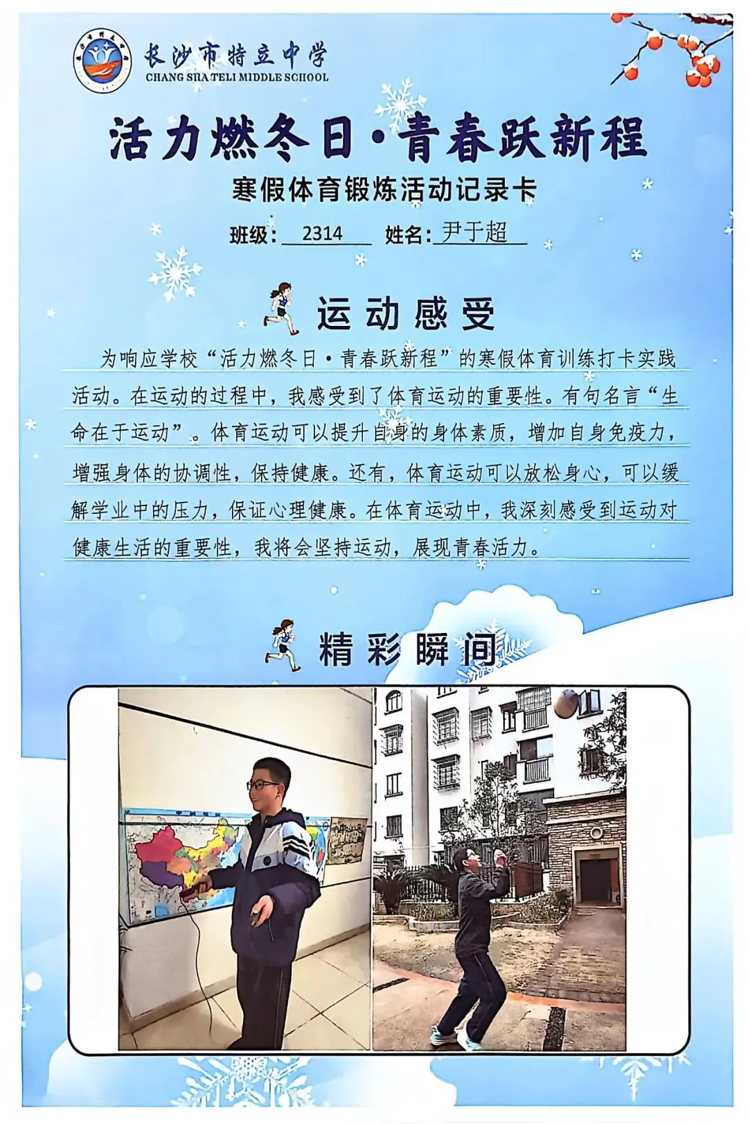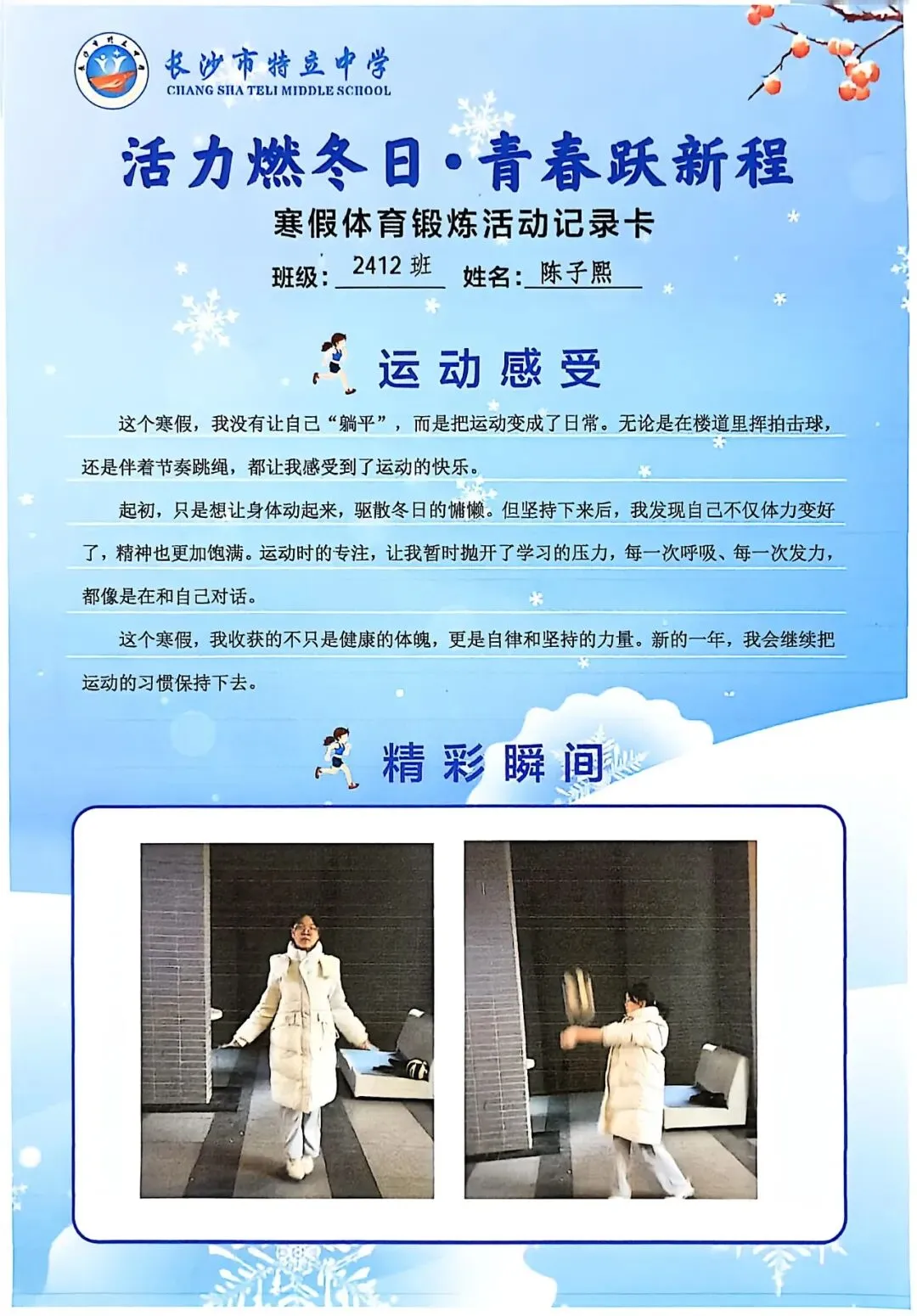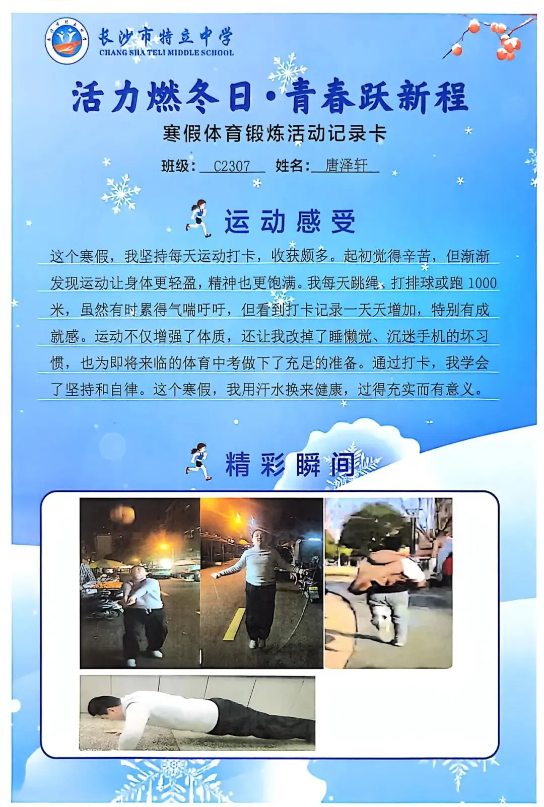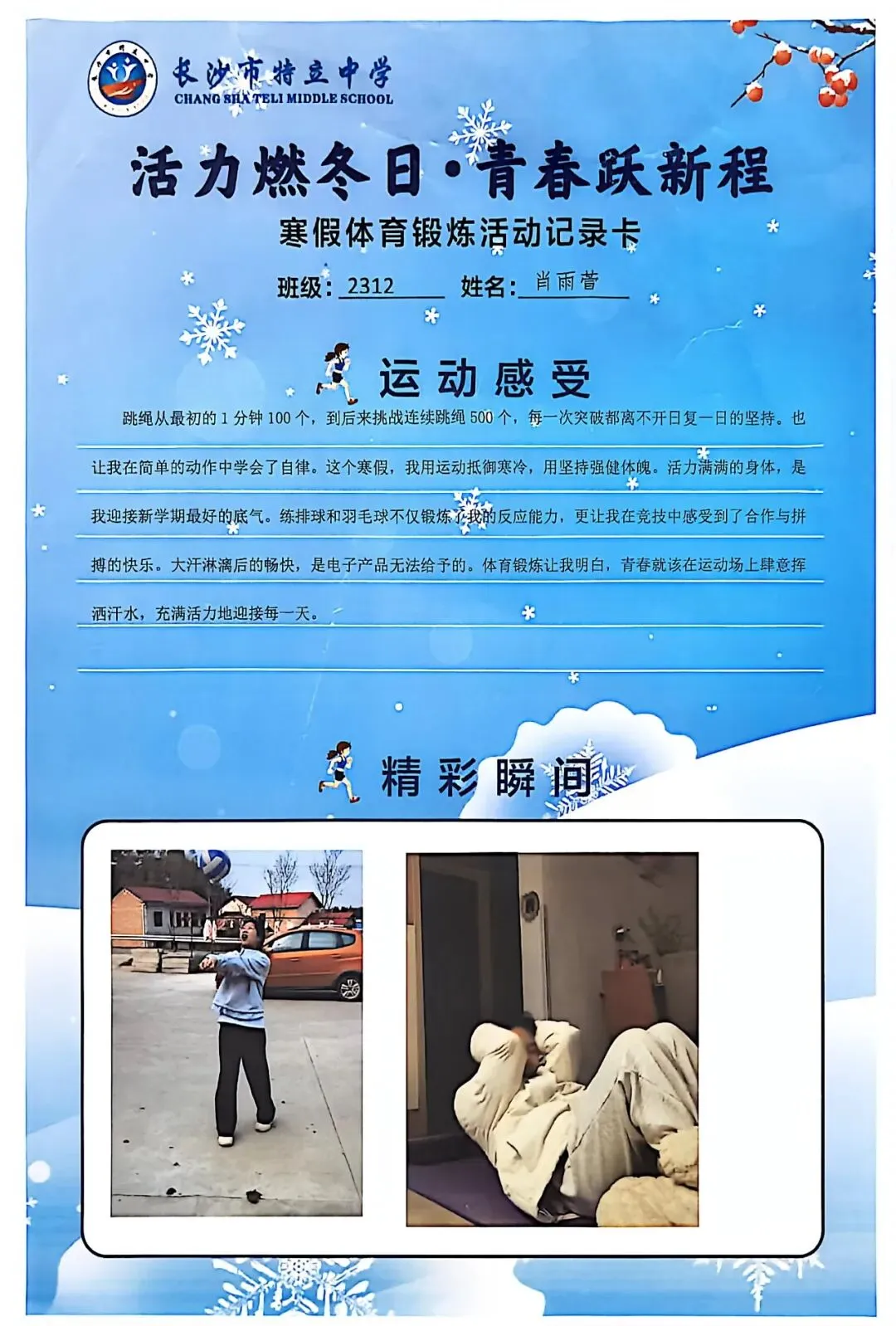 一张张体育锻炼活动记录卡,成为成长的最好见证:运动感受里,有从气喘吁吁到轻松坚持的突破,有从生疏笨拙到熟练掌握的进步,更有在坚持中收获的自律与自信;精彩瞬间中,有挥拍击球的飒爽,有跳跃奔跑的灵动,有亲子运动的温馨。
