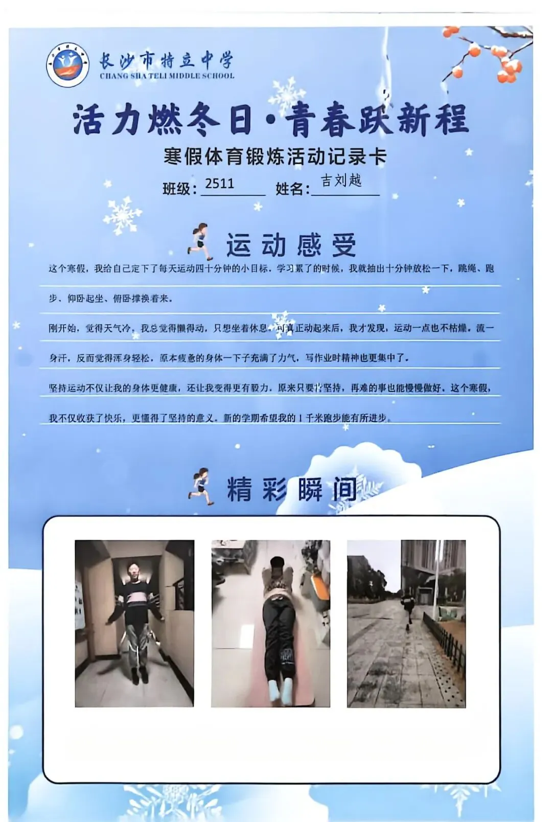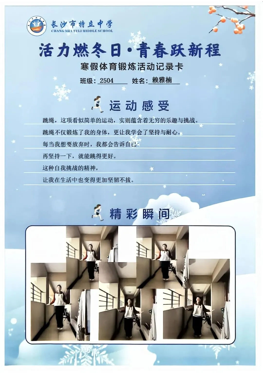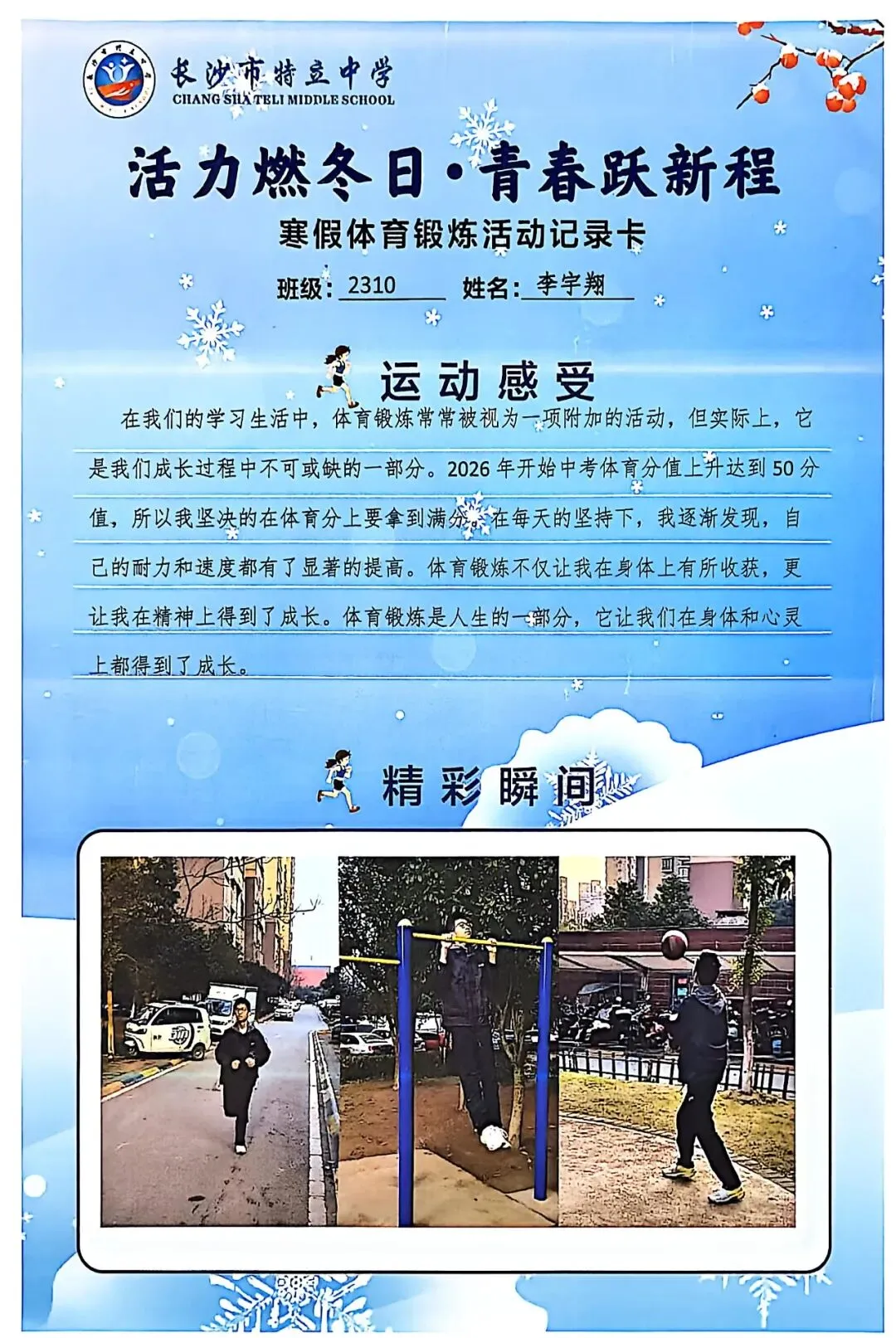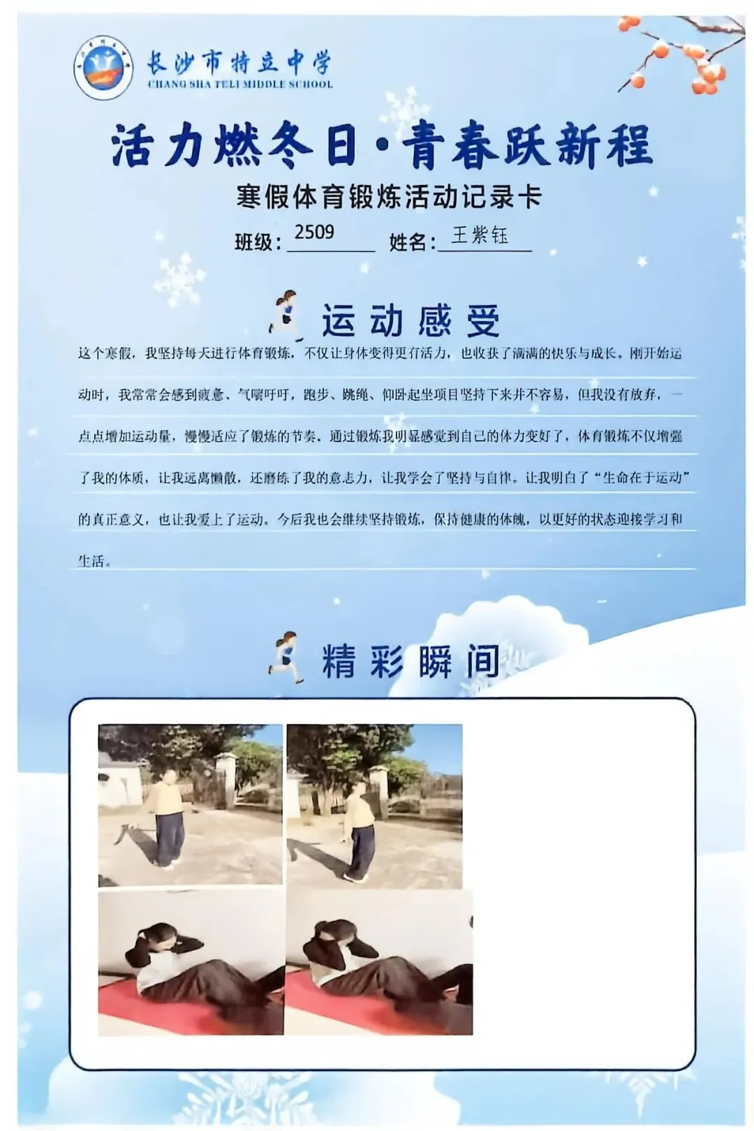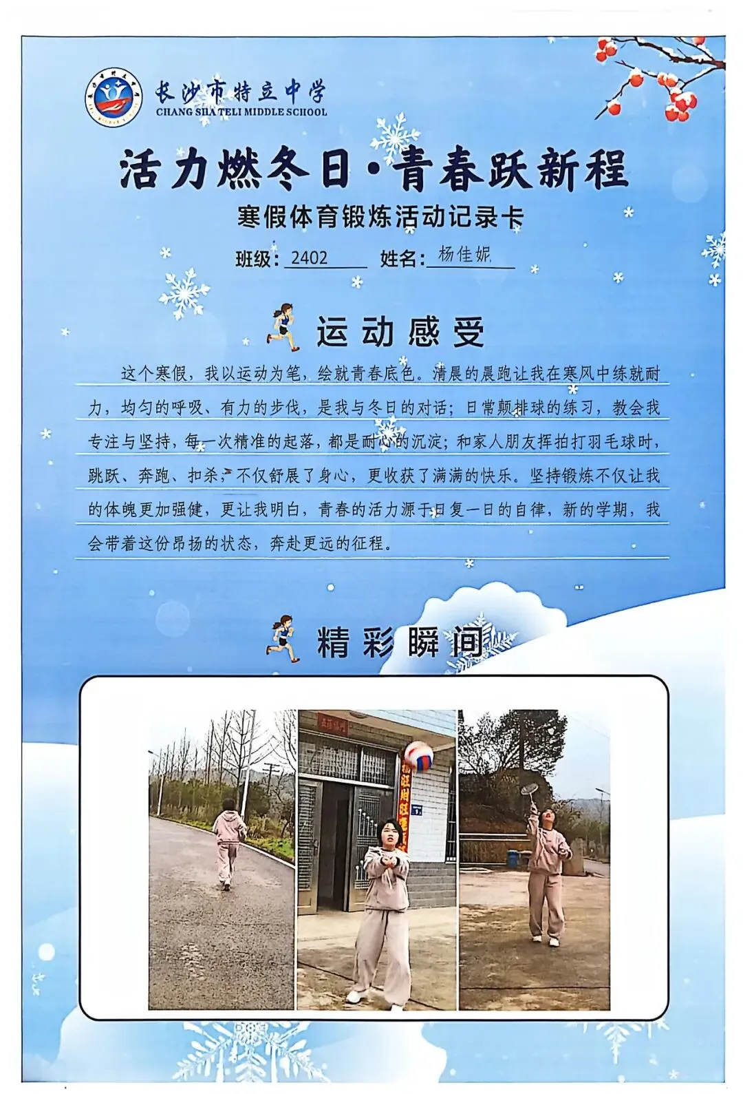 一张张体育锻炼活动记录卡,成为成长的最好见证:运动感受里,有从气喘吁吁到轻松坚持的突破,有从生疏笨拙到熟练掌握的进步,更有在坚持中收获的自律与自信;精彩瞬间中,有挥拍击球的飒爽,有跳跃奔跑的灵动,有亲子运动的温馨。