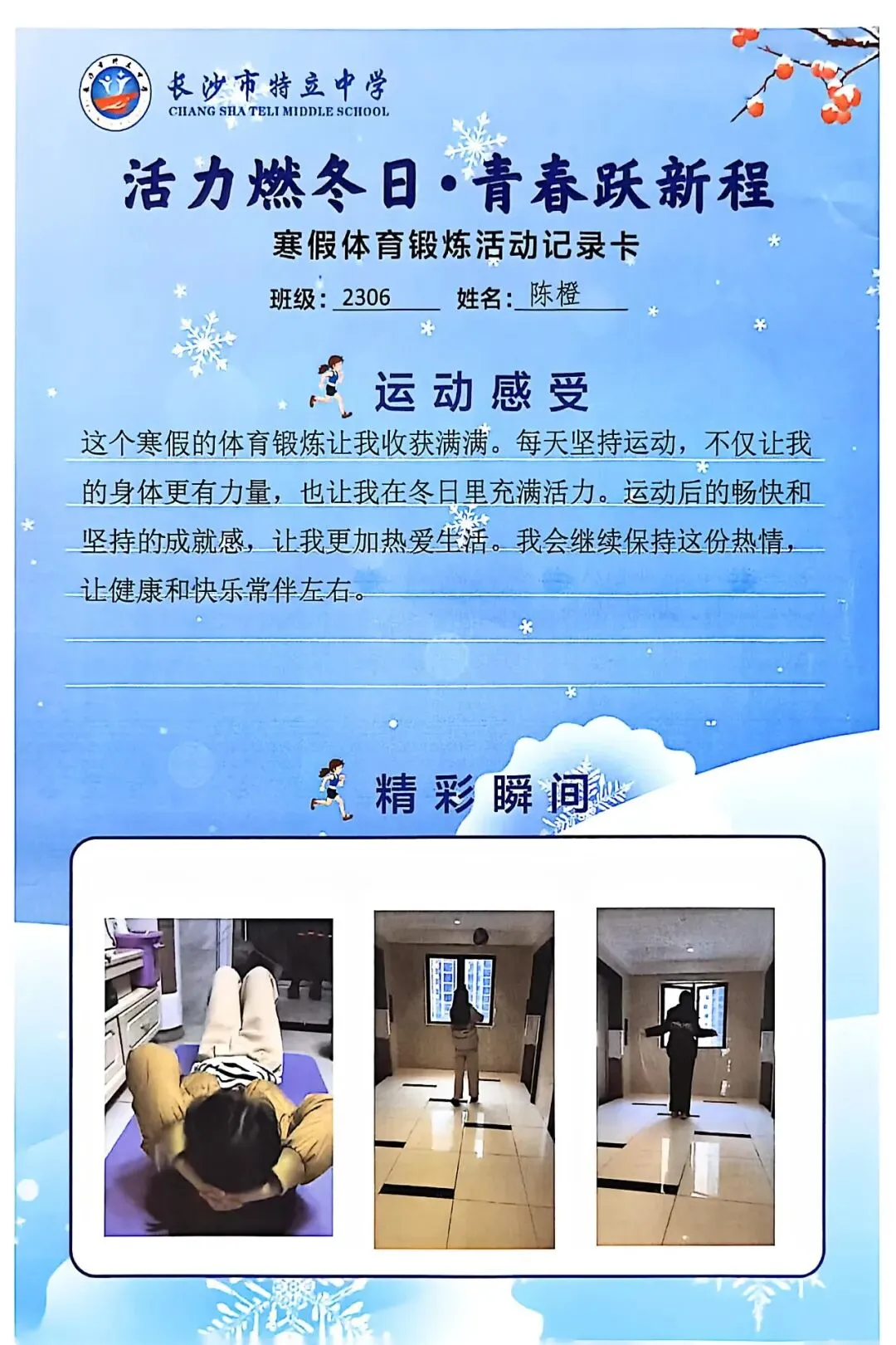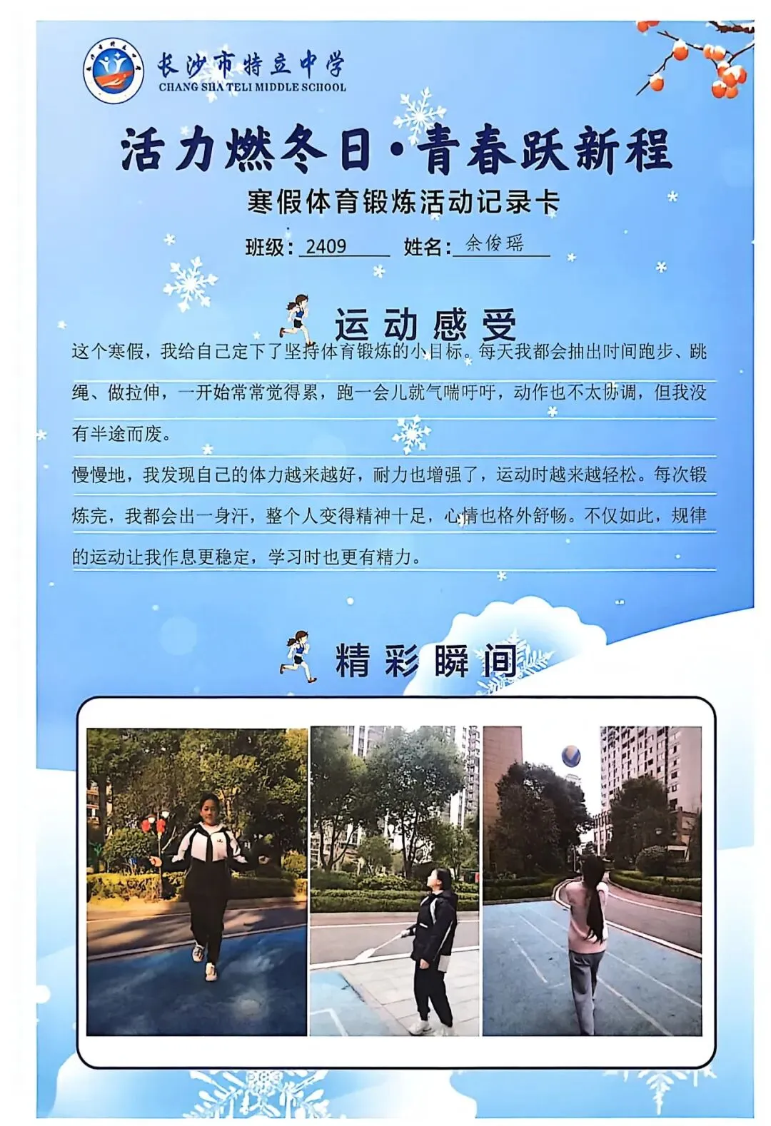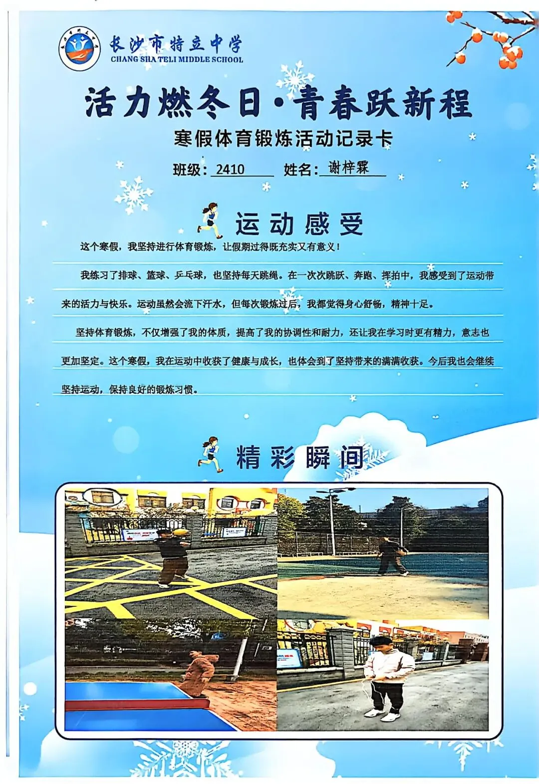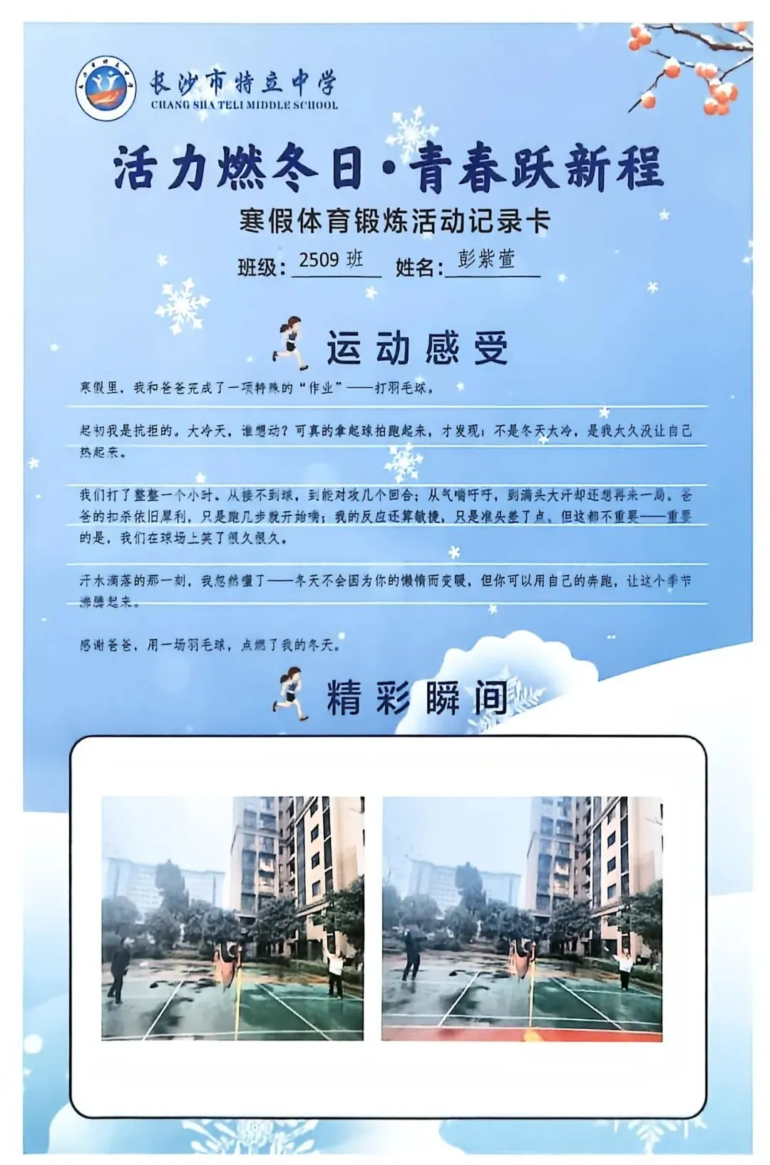 一张张体育锻炼活动记录卡,成为成长的最好见证:运动感受里,有从气喘吁吁到轻松坚持的突破,有从生疏笨拙到熟练掌握的进步,更有在坚持中收获的自律与自信;精彩瞬间中,有挥拍击球的飒爽,有跳跃奔跑的灵动,有亲子运动的温馨。