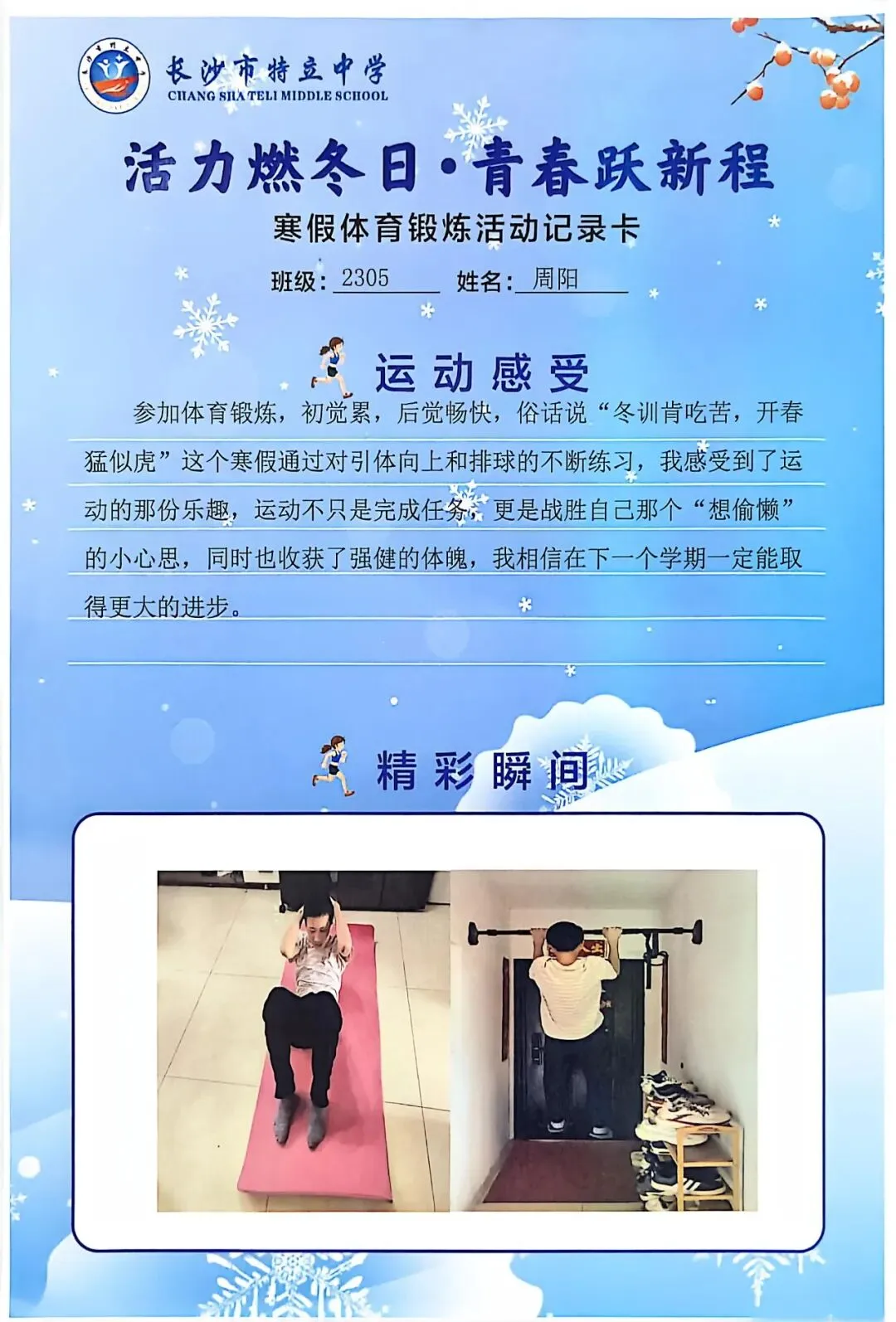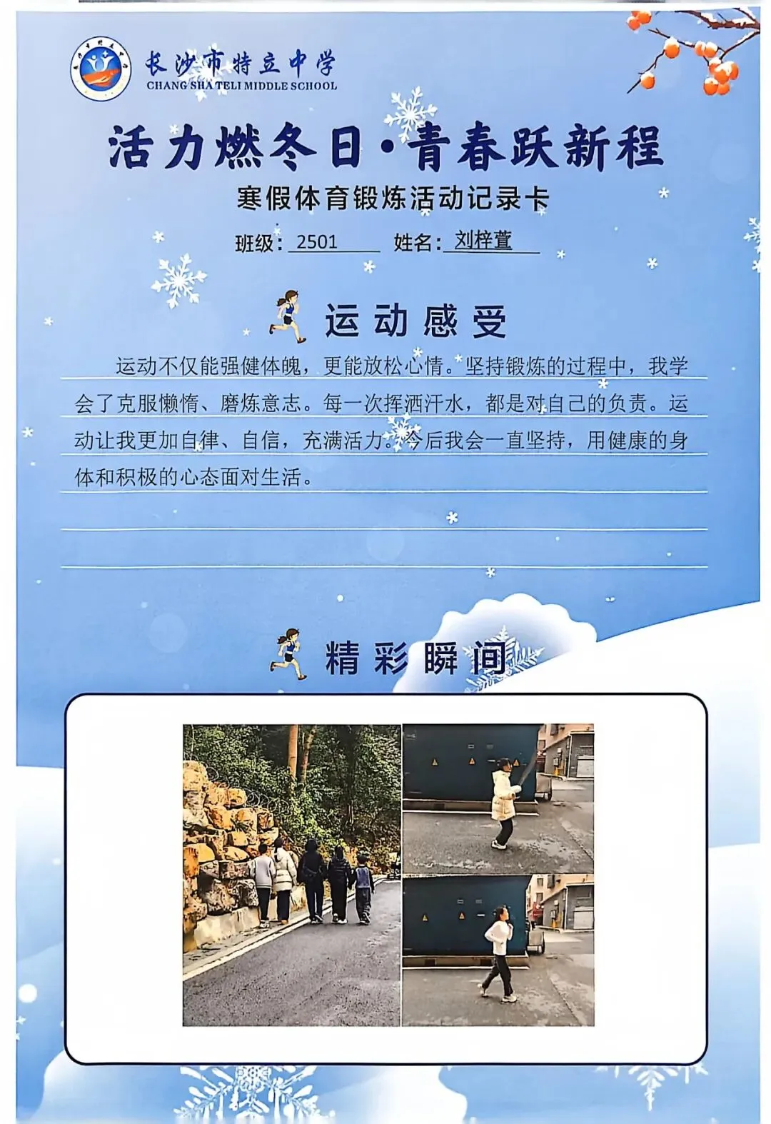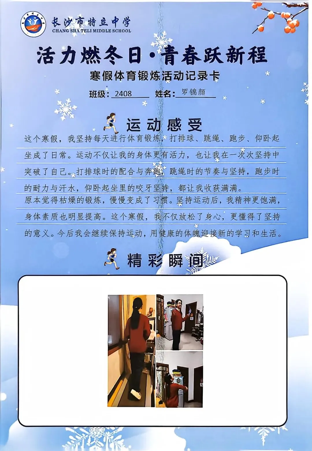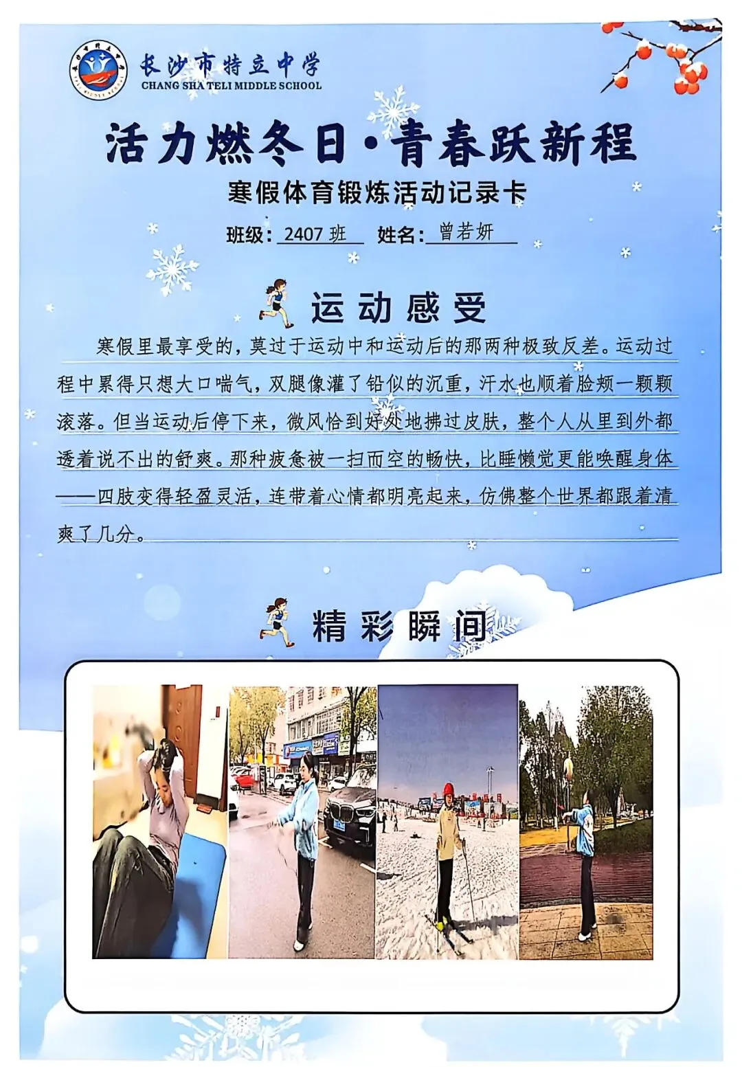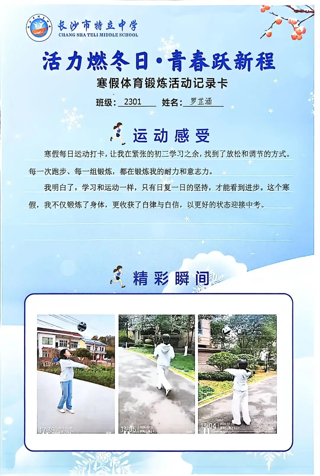 一张张体育锻炼活动记录卡,成为成长的最好见证:运动感受里,有从气喘吁吁到轻松坚持的突破,有从生疏笨拙到熟练掌握的进步,更有在坚持中收获的自律与自信;精彩瞬间中,有挥拍击球的飒爽,有跳跃奔跑的灵动,有亲子运动的温馨。