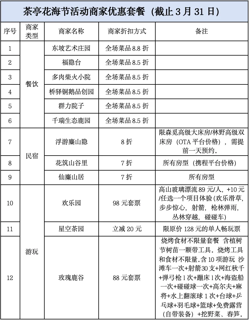 超级霸王餐:中奖后请于3月14日18:00前到茶亭游客中心二楼登记兑换,逾期失效。兑换后全年有效,需提前一天预约(联系人:邓魁峰 18874090200)。
