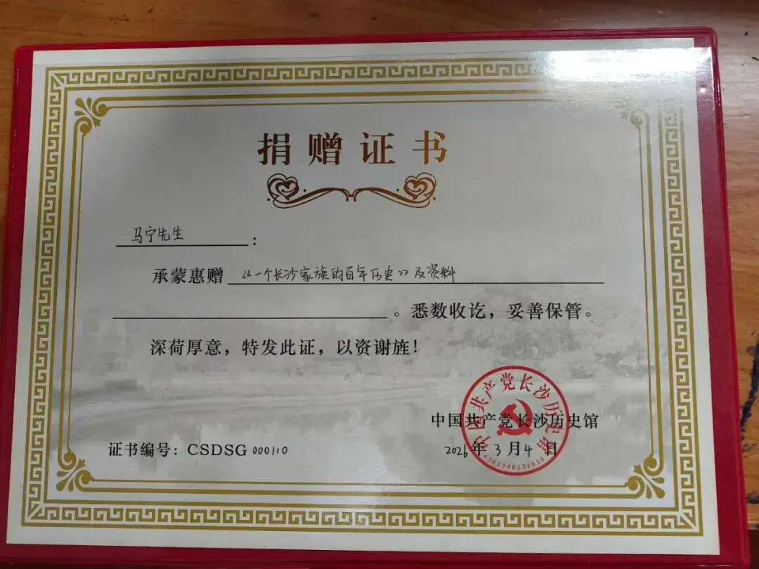 我广泛收集资料写作而成的家族历史回忆《一个长沙家族的百年历史》于2025年12月被联合文化出版社正式出版,网上可公开查阅本书相关信息。书籍深情回忆了我的爷爷奶奶外公外婆的人生历程,也记述了我的祖辈长沙辛亥革命人物、我的舅祖父瞿慎馀烈士(他是长眠于著名的黄花岗烈士陵园唯一一位新民主主义革命时期烈士)、我的曾舅祖父抗日民族英雄谢尔庸等人物。本书因为其重要史料价值及历史文献价值,中国共产党长沙历史馆特意开座谈会将《一个长沙家族的百年历史》作为重要历史见证物颁证珍藏。这体现了长沙党史馆对于长沙地区历史文化的高度重视,也是我和我们家族的巨大荣誉。我和亲人们在长沙党史馆捐赠仪式留影及长沙党史馆颁发的捐赠证书本书详细记述了我的舅爷爷瞿慎馀烈士,他是长眠于著名的黄花岗烈士陵园唯一一位新民主主义革命时期烈士,所以此书同样被黄花岗陵园珍藏。我(右四)和亲人们在黄花岗烈士陵园与黄花岗陵园工作人员留影。赠《一个长沙家族的百年历史》给黄花岗陵园的相关赠言。