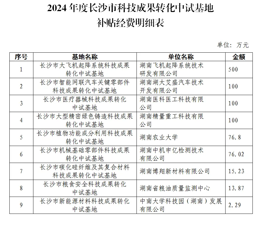 附件:2024年度长沙市科技成果转化中试基地补贴经费明细表