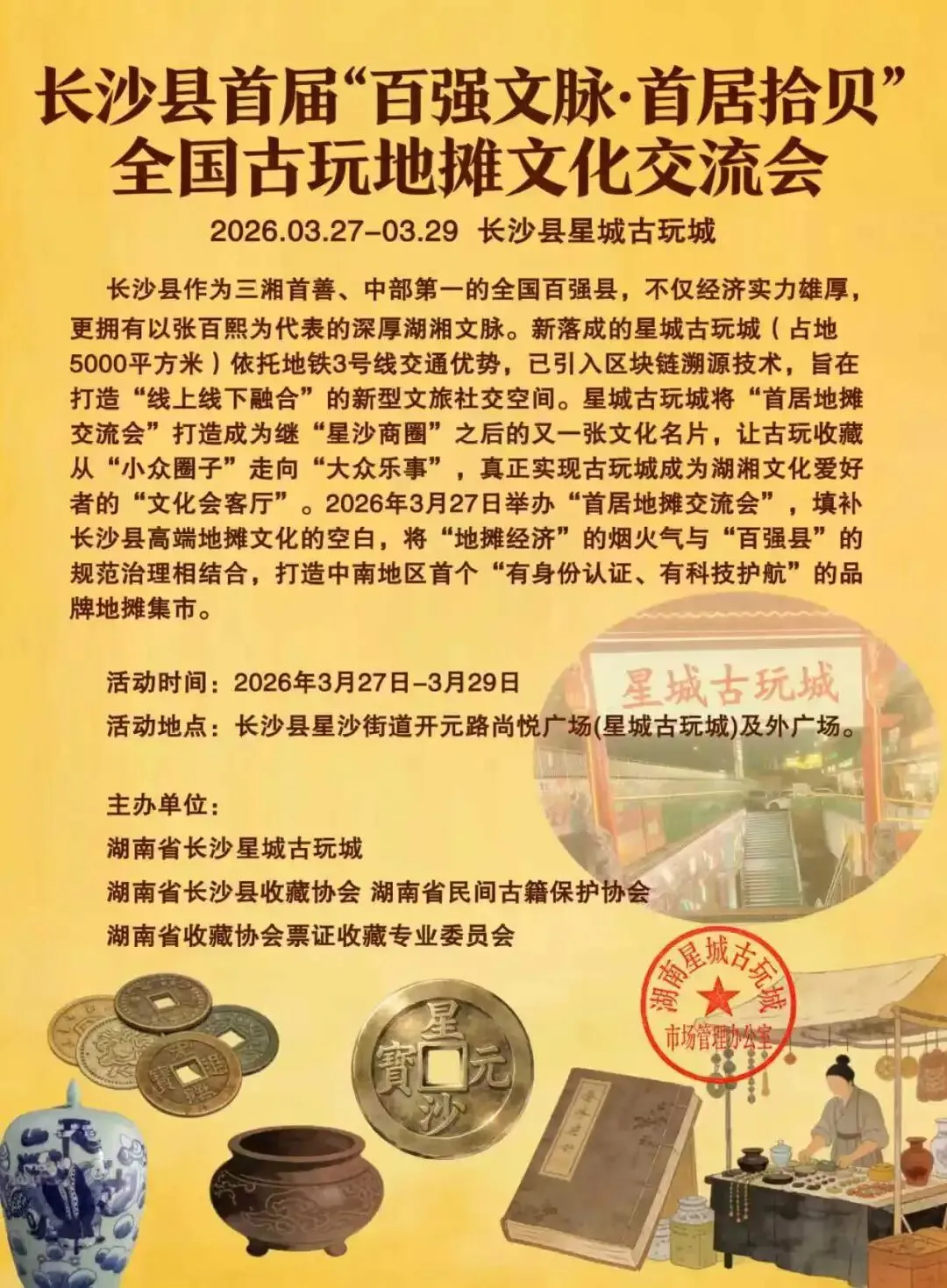 活动地点:长沙县星沙街道开元路尚悦广场(星城古玩城)及外广场。