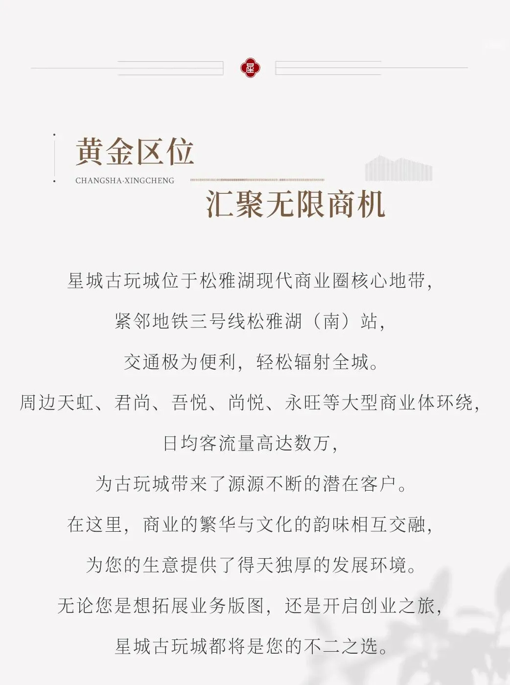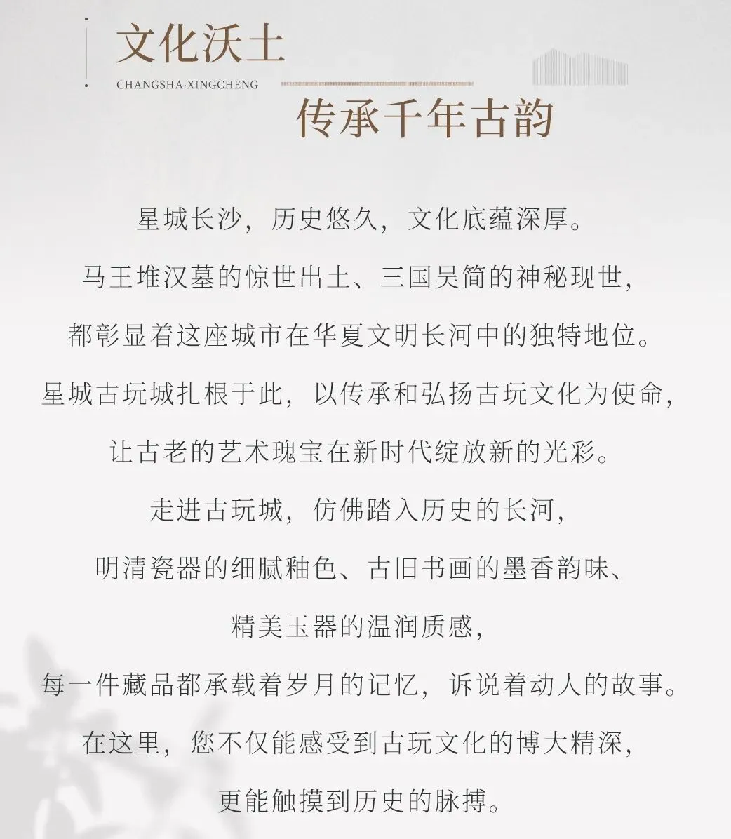 长沙县作为三湘首善、中部第一的全国百强县,不仅经济实力雄厚,更拥有以张百熙为代表的深厚湖湘文脉。新落成的星城古玩城(占地5000平方米)依托地铁3号线交通优势,已引入区块链溯源技术,旨在打造“线上线下融合”的新型文旅社交空间。星城古玩城将“首居地摊交流会”打造成为继“星沙商圈”之后的又一张文化名片,让古玩收藏从“小众圈子”走向“大众乐事”,真正实现古玩城成为湖湘文化爱好者的“文化会客厅”。2026年3月27日举办“首居地摊交流会”,填补长沙县高端地摊文化的空白,将“地摊经济”的烟火气与“百强县”的规范治理相结合,打造中南地区首个“有身份认证、有科技护航”的品牌地摊集市。