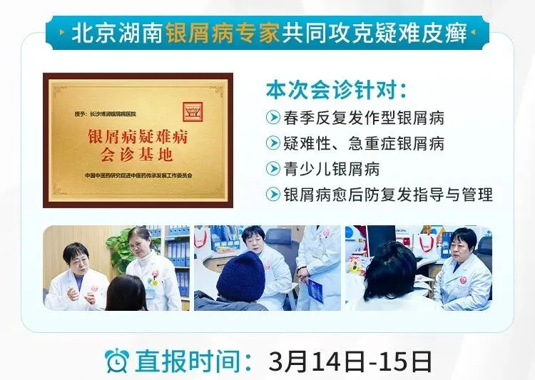 为帮助大家应对春季银屑病易复发、扩散问题,长沙博润银屑病医院特邀北京知名银屑病专家,3月14-15日(本周六、周日)亲临我院开展联合会诊,为患者提供一对一诊疗、方案优化、抗复发指导。