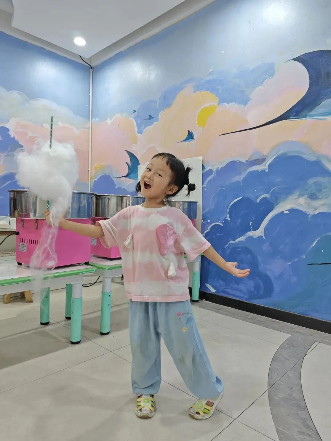 这里边最好玩的是各个小教室,磨豆浆、做棉花糖、装扮走秀、做美甲、做钥匙扣、玩乐器、玩沙画、玩泥巴的,还有砖块积木、大泡沫积木、钓鱼和海洋球室等,包括一个小型淘气堡和蹦蹦床(低年龄小朋友不要玩蹦蹦床,太容易伤到腿,阿普就有一次说腿用不上力,后边再没玩过)。一二三楼有点闷,可以去四楼透透气,四楼是游乐区,夏天可以玩水(但是洁净度不明)。