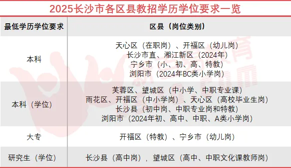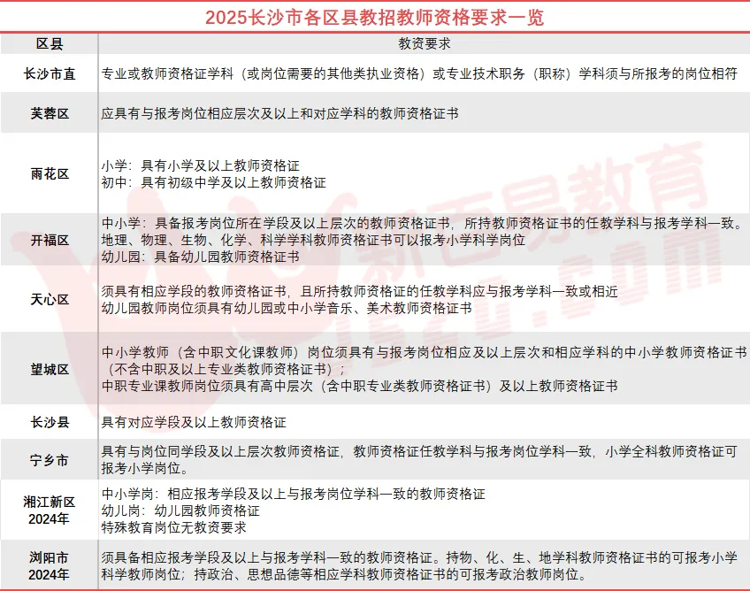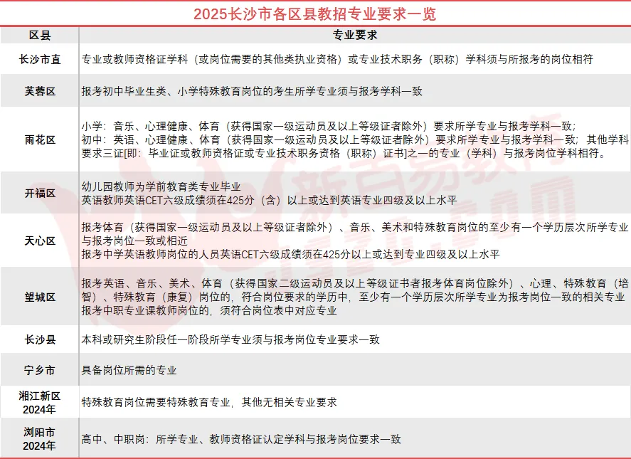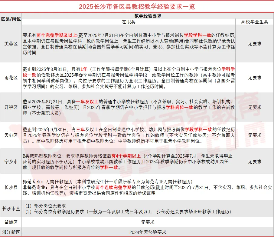 ✅ 两年经验要求:宁乡市✅ 三年经验要求:天心区✅ 无经验要求:望城区、湘江新区、长沙县(师范专业)