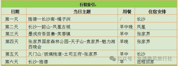 1、交通:旌德往返长沙南动车二等座位;当地空调2+1车4、门票:韶山、凤凰、墨戎夯吾苗寨、芙蓉镇、魅力湘西晚会或张家界千古情晚会、张家界国家森林公园、天子山、天门山-玻璃栈道、土司王府、橘子洲头温馨提示:如天气、堵车、排队原因等不可抗拒因素,地接导游在不影响行程的情况下有权调整行程所含景点的游览先后顺序。5、购物:全程一个土特产超市。景区内商铺属商业行为,游客自由购物。必消项目:(芙蓉镇酉水画廊船票+环保车)+(天门山索道+扶梯+鞋套)+(森林公园百龙电梯或者索道)优惠套餐280元/人8、该线路享受门票优惠政策,任何人群无优惠无退费。报名地址:旌德徽风国际旅行社