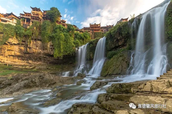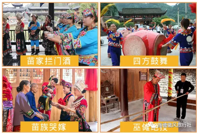 早餐后,BUS前往参观【墨戎夯吾苗寨】苗寨是美丽峡谷中古老而神奇的苗寨,是镶嵌在神密湘西的一朵奇葩。苗寨居住着百余户苗民,至今留存着千年古俗。是天下闻名的苗鼓之乡,男女老少皆爱“跳鼓”,曾出过五代苗鼓王。繁衍于斯的苗族同胞,千百年来安居乐业,他们讲苗语,穿无领绣花衣,以歌为媒,自由恋爱;晨昏作息,等闲生死;歌舞沉酣。姑娘喜欢用银饰打扮自己,男人爱结绑腿,吹木叶,喜武术。他们自己种棉,养蚕纺纱织布,用古老的方法榨油,造纸,碾米,织布,用筒车提水灌田。......BUS赴网红景点芙蓉镇,游览挂在崖壁和瀑布上的千年古镇——【芙蓉镇】:酉水画廊素有“湖南小三峡”之称,坐上游船可感受两岸猿声抵不住,轻舟已过万重山的意境,它是沈从文笔下最后的一段风景,有着湘西最美河流之称的“酉水风情画廊”2015年首次向世人揭开神秘的面纱。现在的酉水两岸仍保留着一种古朴的方式,船工号子依然高亢,山歌小调温婉如昔,讲述着这山这水这人的快乐与沧桑,悬棺 观音坐莲 酉水大峡谷,给人古朴新奇,幽静而又能让人激动人心的感受!后登船上岸于王村古街,游览帝王之村落,感受王者之风范,此处曾经是土司王休闲度假之地,保存完好的土司王行宫亭楼别苑,真正体会帝王之行,1986年因电影晚《芙蓉镇》的拍摄王村得其美称“芙蓉镇”。