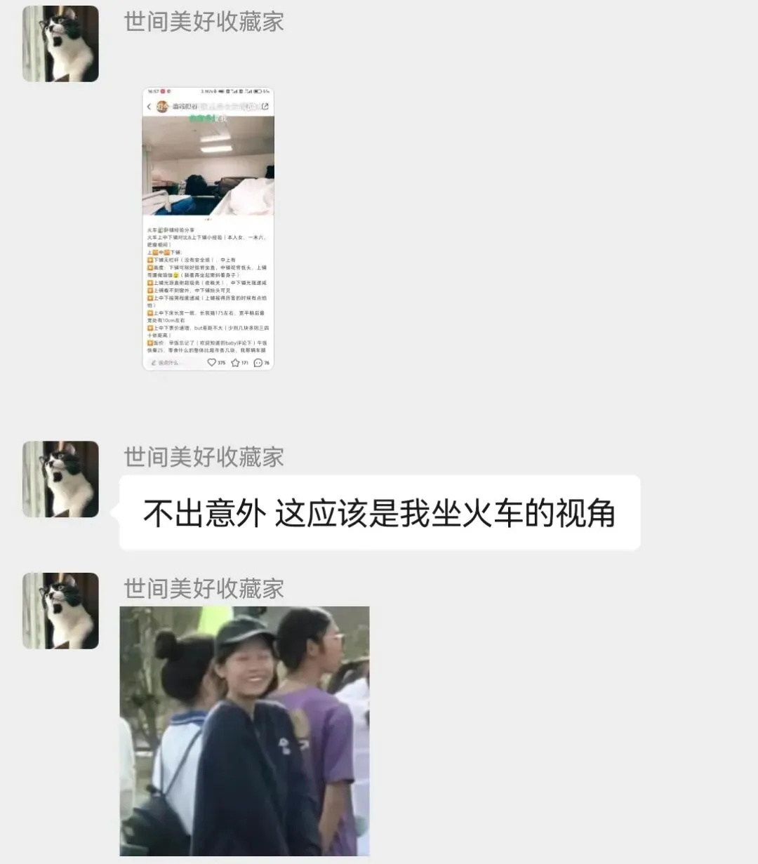 这个时候就有同学要问了:老师,老师,关东组不是6个人吗?这车票怎么只有5个人呢?这里老师给大家解答一下🧑🏫:由于苗同志对自己的臀部肌肉组织的抗疲劳能力有相对的自信。臀肌耐力超群,坐骨结节顿感强化,臀部适应能力更强,所以她选择了硬座直达。大家甚至都已经开始看在火车上自己的视角了: