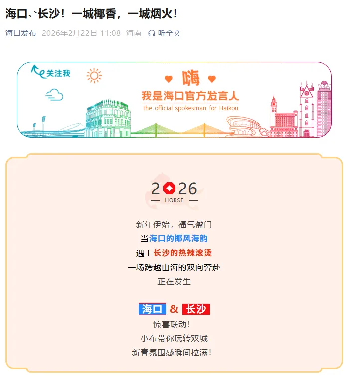 从“文化输出”到“文化共享”:长沙与武汉交换年夜饭、与成都共推“辣味”打卡攻略、与无锡共赏“山水洲城”与“江南园林”。在这场对话中,每座城市既是讲述者,也是倾听者。