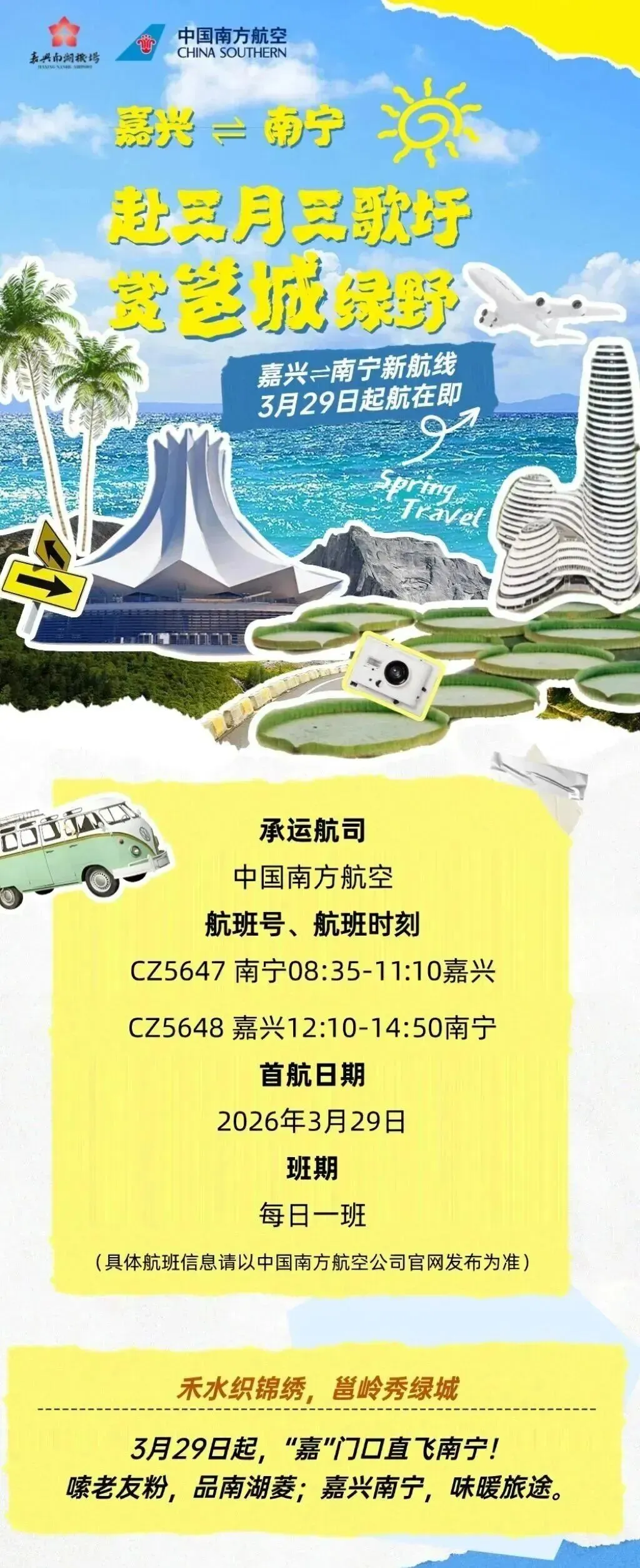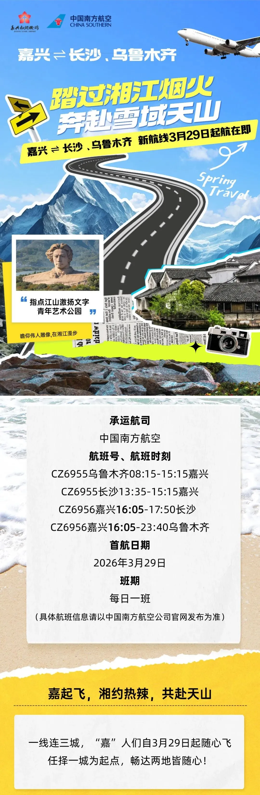 据嘉兴南湖机场、南方航空等消息
