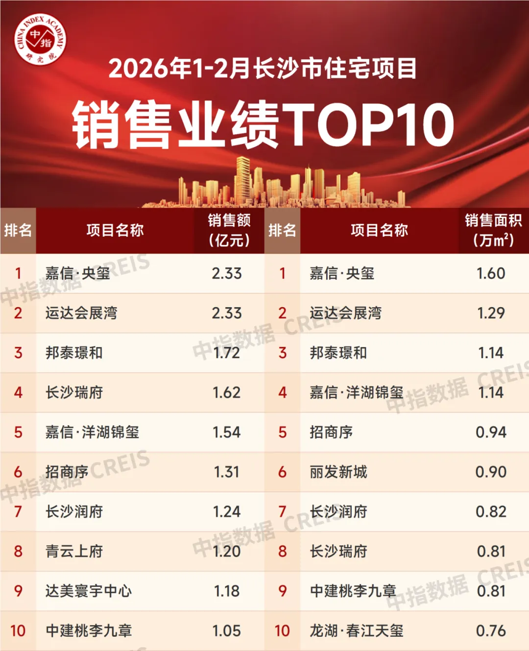 特别声明:房地产企业销售数据统计是以2026年1月1日-2月28日期间销售的商品房为统计口径,主要依据中指数据CREIS(点击查看)在长沙市内六区的销售监测数据,并参考企业提供的相关数据,经课题组严格审核纳入统计,涉及合资项目,销售数据划归于操盘企业。本报告仅供参考,课题组不对使用报告及其内容所引发的任何直接或间接损失承担责任。