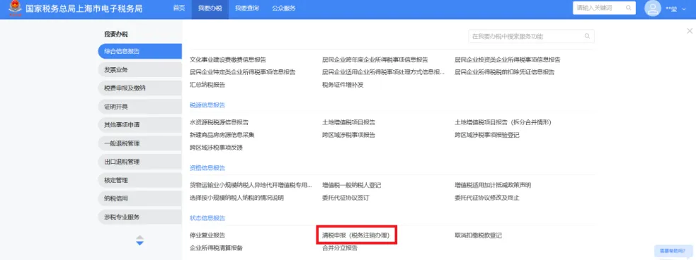 点击菜单路径:【我要办税】——【状态信息报告】——【清税申报(税务注销办理)】。