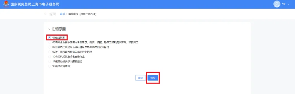 点击【预检】按钮,系统开始校验是否符合注销条件。
