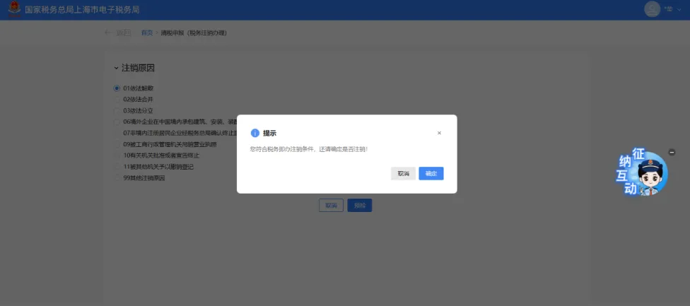 系统弹出提示:“您符合税务即办注销条件,还请确定是否注销!”