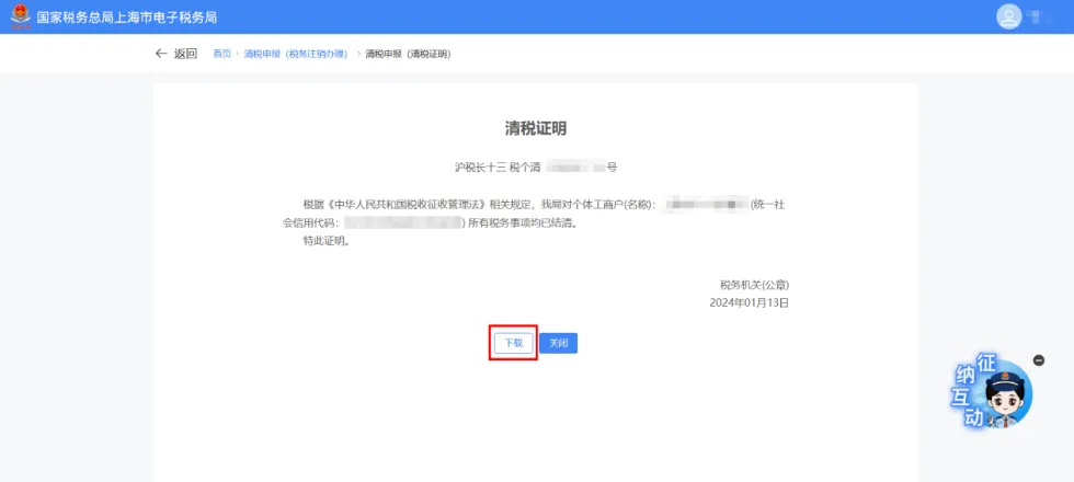 点击【下载】按钮,即可保存电子版《清税证明》。