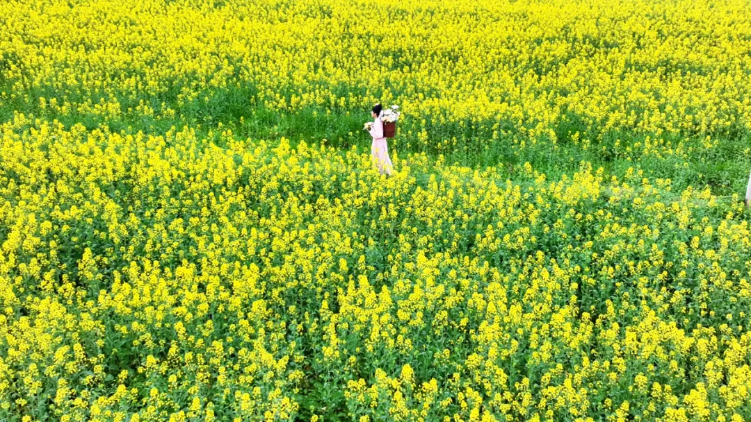 走进花海才知道,油菜花可以这么高,高过膝盖,高过大腿。花浪一层一层往前推,像金黄色的海。
