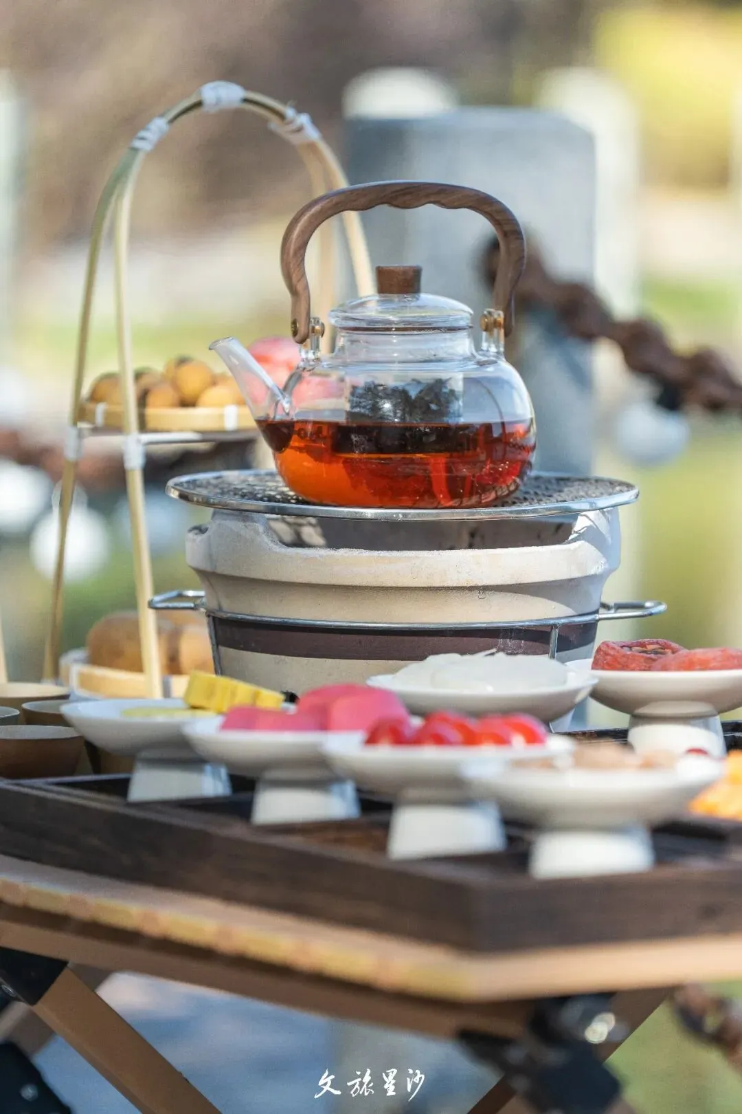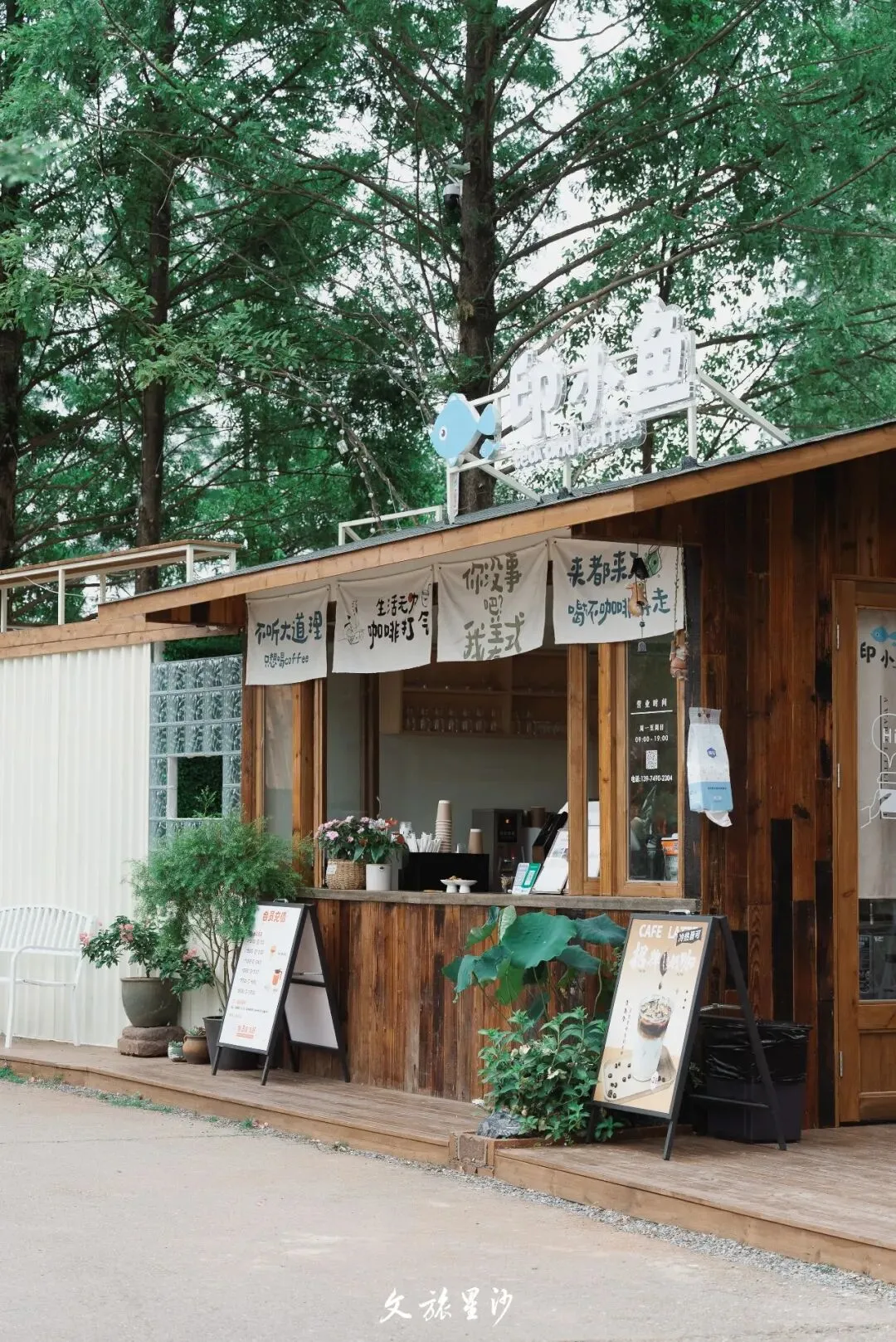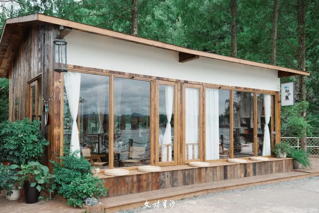 想要临水品茶,可以到湖畔的「印小鱼茶咖馆」。点上一杯或醇厚或清冽的茶,或是一杯冰美式,再配一块桂花米糕,坐看游船在眼前划过,观山水共长天一色,惬意。