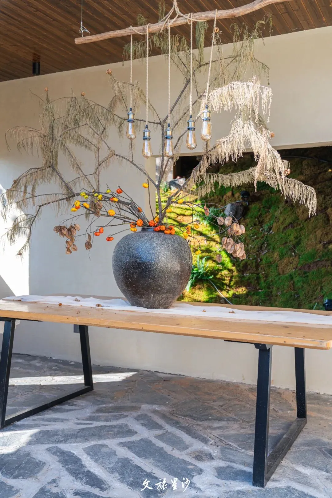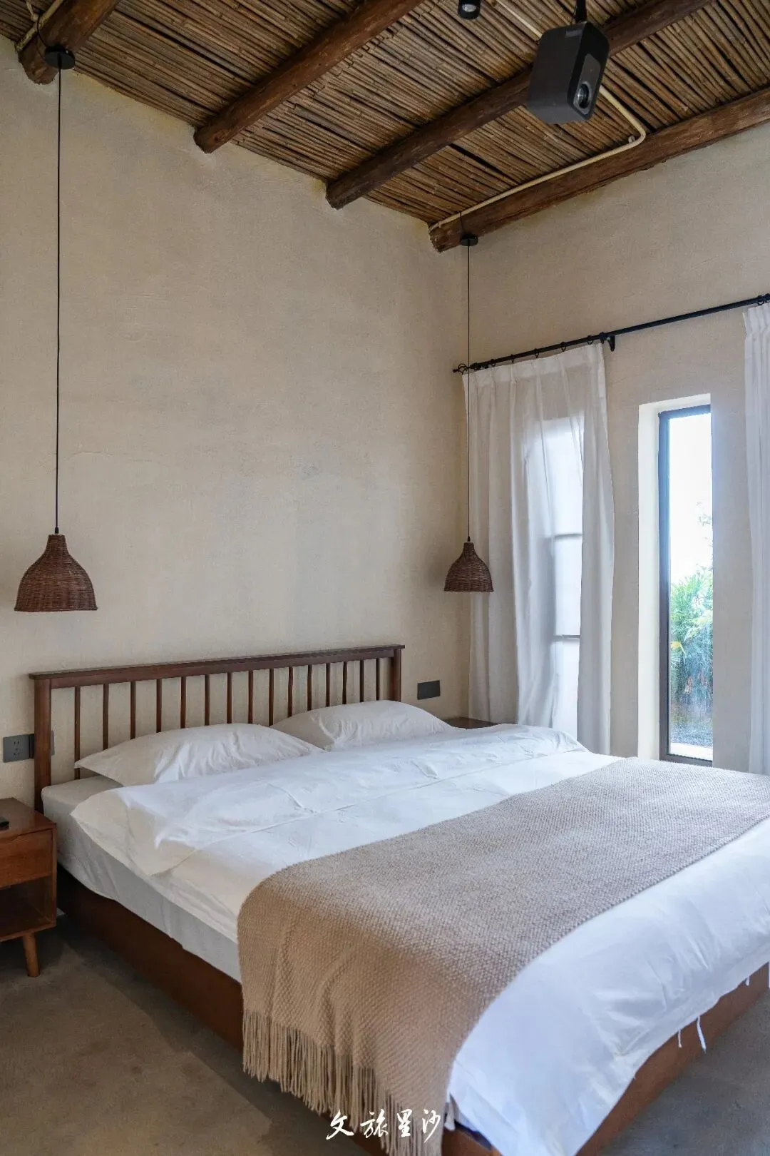 木梁、土墙、竹帘,勾勒出中式院落的独特韵味,大玻璃窗与嵌入式灯光又巧妙融入现代舒适感。在这里,躺着也能看见山影倒进湖里。