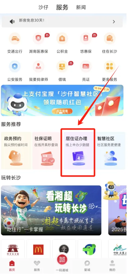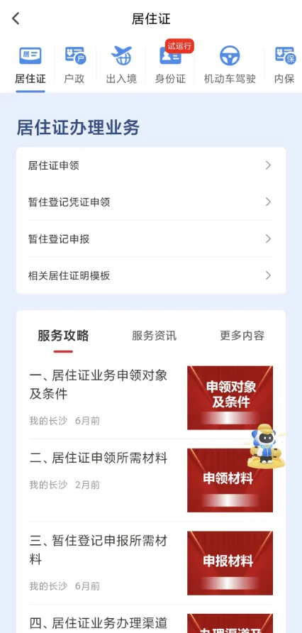 在【我的长沙APP】点击【居住证办理】,选择对应的居住证办理业务。