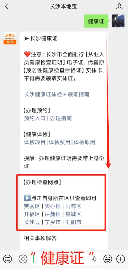 友友们可以长按下方二维码,关注并进入【长沙本地宝】,后台聊天框发送【健康证】,即可获得各区健康证办理检查地点啦~