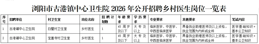 因工作需要,浏阳市古港镇中心卫生院决定面向社会公开招聘乡村医生2名,现就有关事项公告如下: