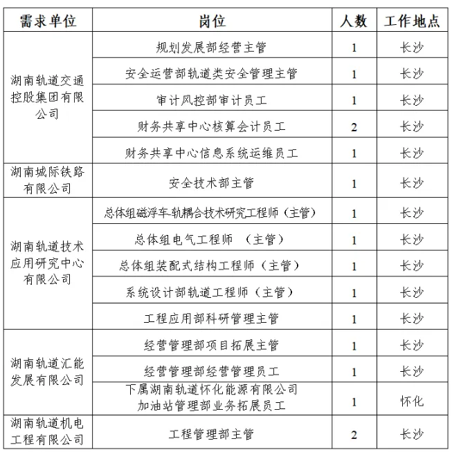 根据工作需要,湖南轨道集团及上述下属公司面向社会公开招聘优秀人才,具体公告如下: