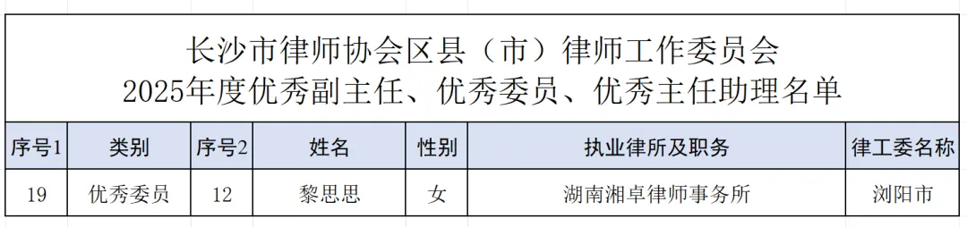 喜报传来,荣耀绽放!近日,长沙市律师协会正式揭晓2025年度长沙市律师协会区县(市)律师工作委员会、专门专业委员会优秀副主任、优秀委员、优秀主任助理名单。湖南湘卓律师事务所黎思思律师,凭扎实的专业功底、亮眼的工作实绩和满满的行业担当,成功获评“长沙市律师协会区县(市)律师工作委员会2025年度优秀委员”称号!