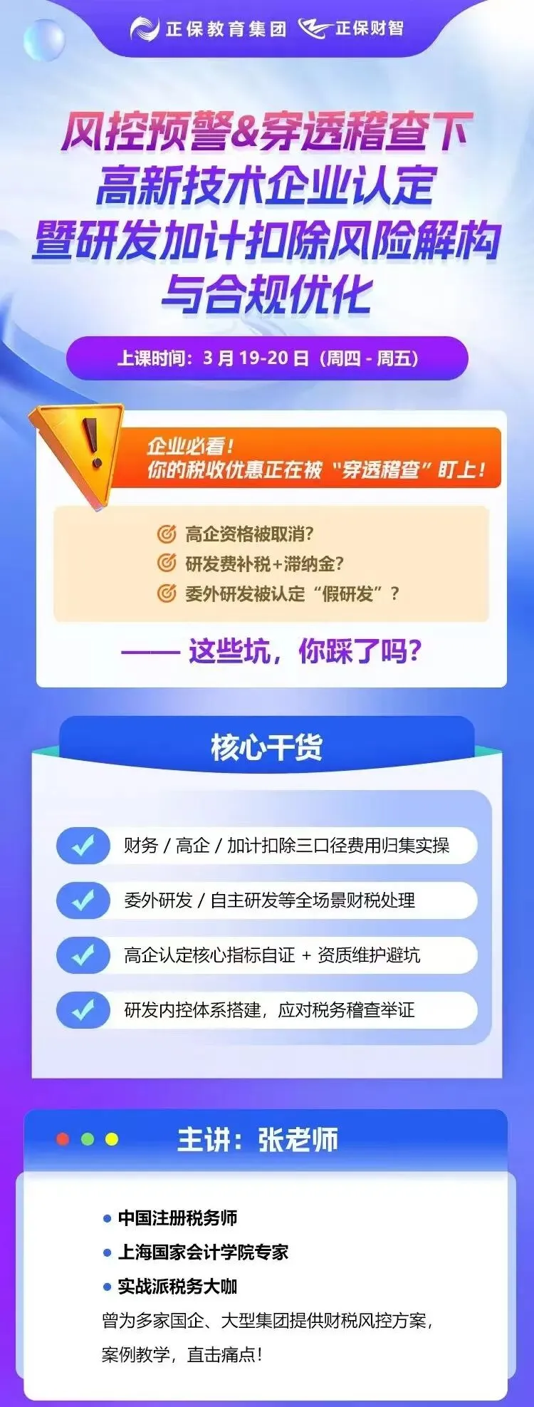 【长沙高企财务必看】3月19日免费试听!已有企业被撤销资格,张老师亲授2026年研发费稽查、高企复核、增值税新政三大风险防御术