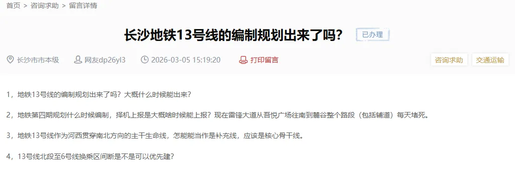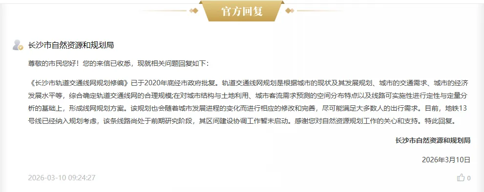 近日,有网友咨询长沙地铁13号线的最新进展,询问地铁13号线的编制规划出来了吗、大概何时能出等问题。