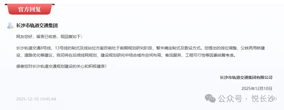 但长沙市轨道交通集团随后进行了回复,明确地铁13号线的制式及线站位方案目前处于前期规划研究阶段,暂未确定制式及敷设方式。
