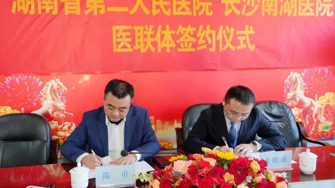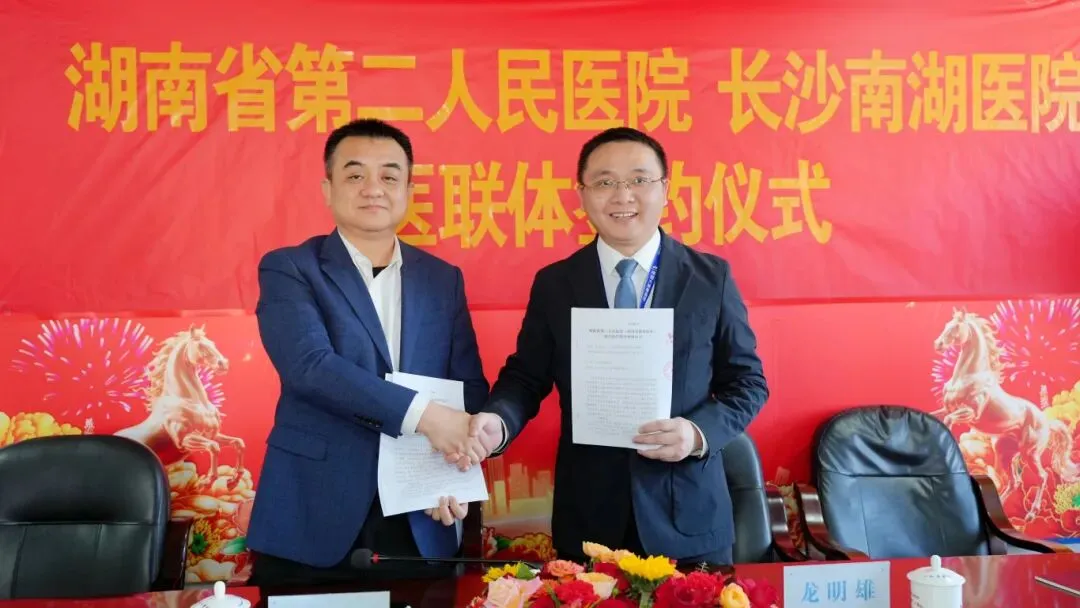 湖南省第二人民医院党委副书记、工会主席陈勇与长沙南湖医院院长龙明雄代表双方完成签约。此次合作聚焦内科、结石病、骨病三大核心专科领域,双方将整合优质资源,构建一体化联合救治体系,打破院际医疗服务壁垒,推动专科诊疗能力的整体提质升级。