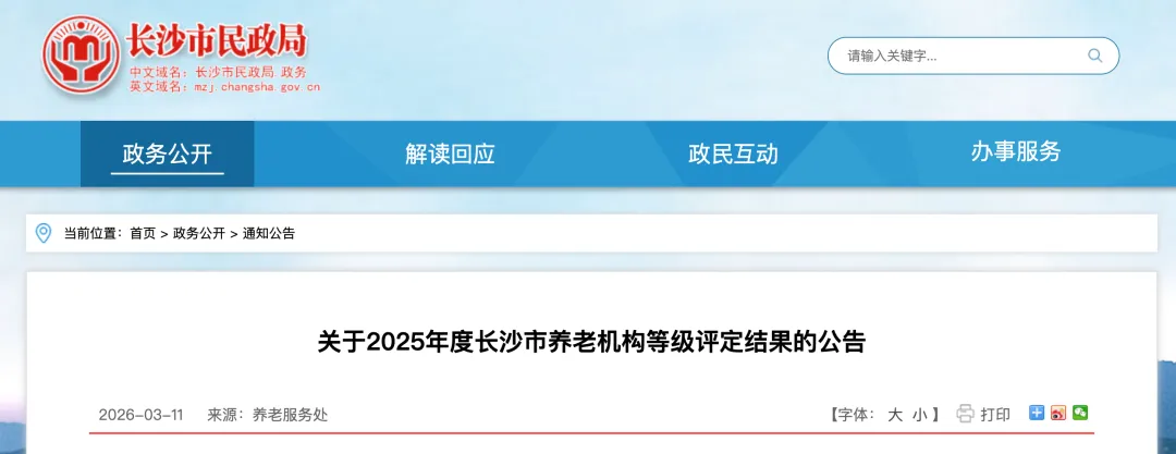 根据《长沙市民政局关于印发<长沙市养老机构等级评定实施细则(试行)>的通知》(长民发〔2023〕8号)有关规定,经养老机构自愿申报、区县(市)民政部门初审把关、市级养老机构等级评定委员会办公室审查、专家实地综合评定、市级养老机构等级评定委员会集体评审、评定结果公示、局党组会审定等程序,现对2025年度确定为四级和三级的养老机构予以公告。