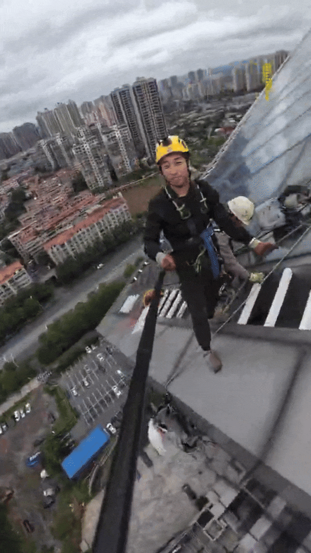 他在全网拥有超40万粉丝,账号分布在抖音、B站、快手、视频号和小红书等平台。视频大多为第一人称视角,拍摄记录他在云端的工作:系绳子,下滑,在高空看一眼城市天际线,或是拿着自拍杆,站在大楼边缘。