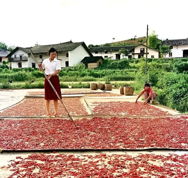 辣椒可是长沙人家家户户离不了的调味品。80年代初的村头,大片红彤彤的辣椒在太阳底下哗啦啦铺开。婆婆、姐妹都在翻动辣椒,空气里都是阳光和辣椒的味道。那一地的红,真叫人觉得日子有盼头!