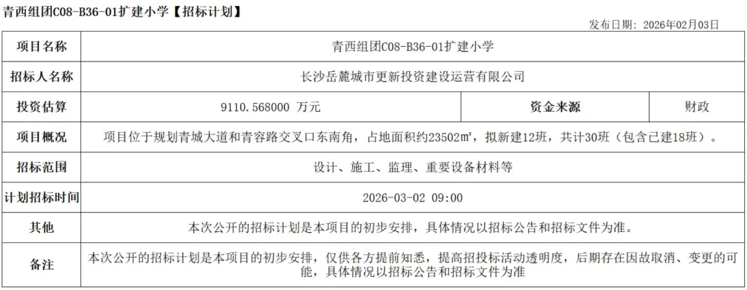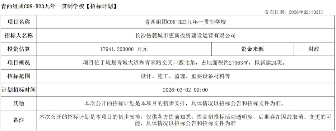 定位为九年一贯制公办学校,将补齐片区义务教育阶段学位缺口,辐射青熙家园、青秀家园等安置小区及新建商品住宅。