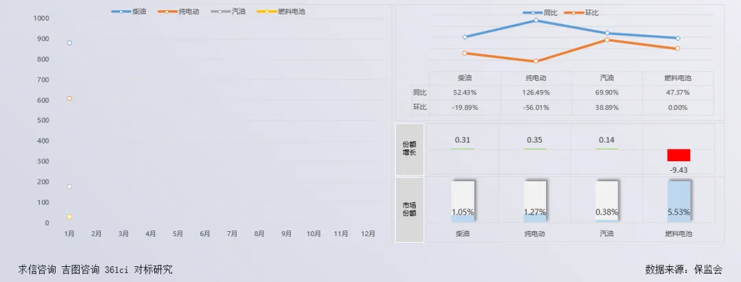 动力方面,本期销售车型涵盖4种燃料,其中搭载柴油发动机的车型占主导地位,占比52.01%,销量878辆,同比增长52.43%,环比增长-19.89%,占柴油市场份额1.05%,较上年同期扩大0.31个百分点。累计销量878辆,增速52.43%。