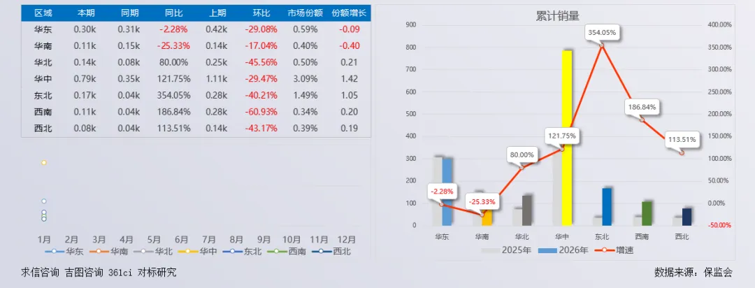 该企业在华中地区表现优异,本期销量785辆,同比增长121.75%,环比增长-29.47%,销售占比46.50%,占当地市场份额3.09%,较上年同期扩大1.42个百分点。