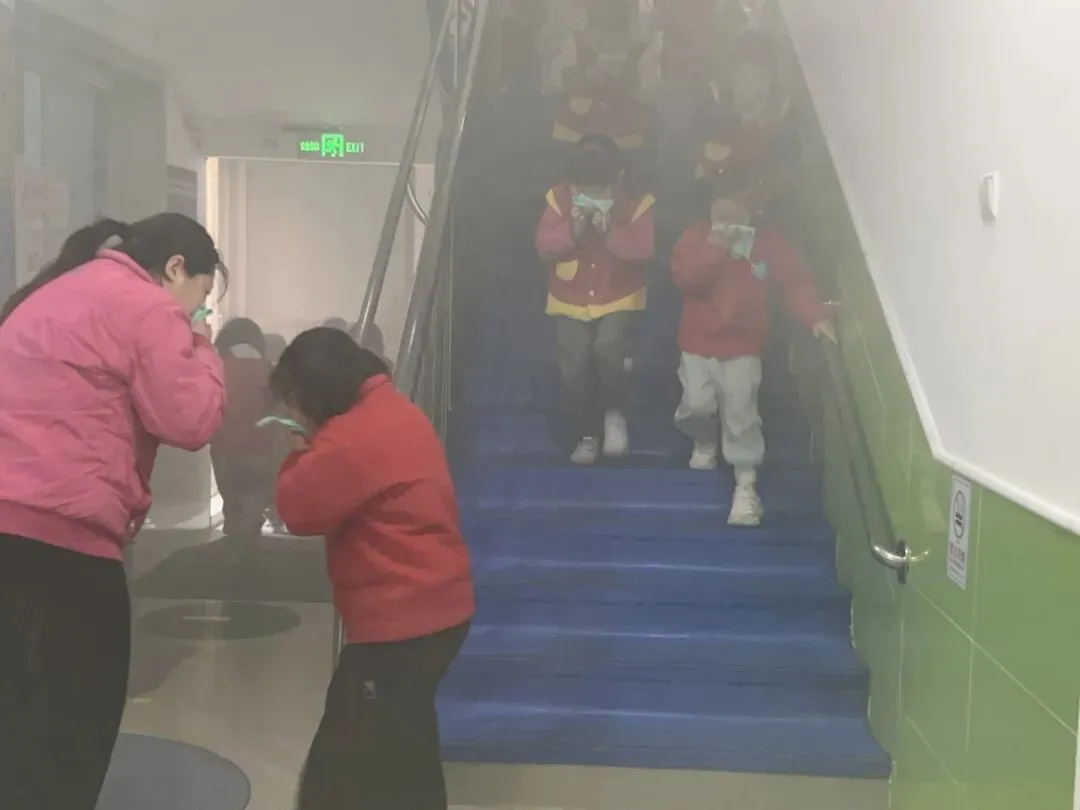随着警报声响起,消防应急演练正式开始。模拟火情触发后,通讯联络小组第一时间启动报警程序。各班教师迅速组织幼儿按照既定疏散路线撤离,孩子们用湿毛巾捂住口鼻,弯腰低姿,在老师的带领下有序向安全区域疏散。