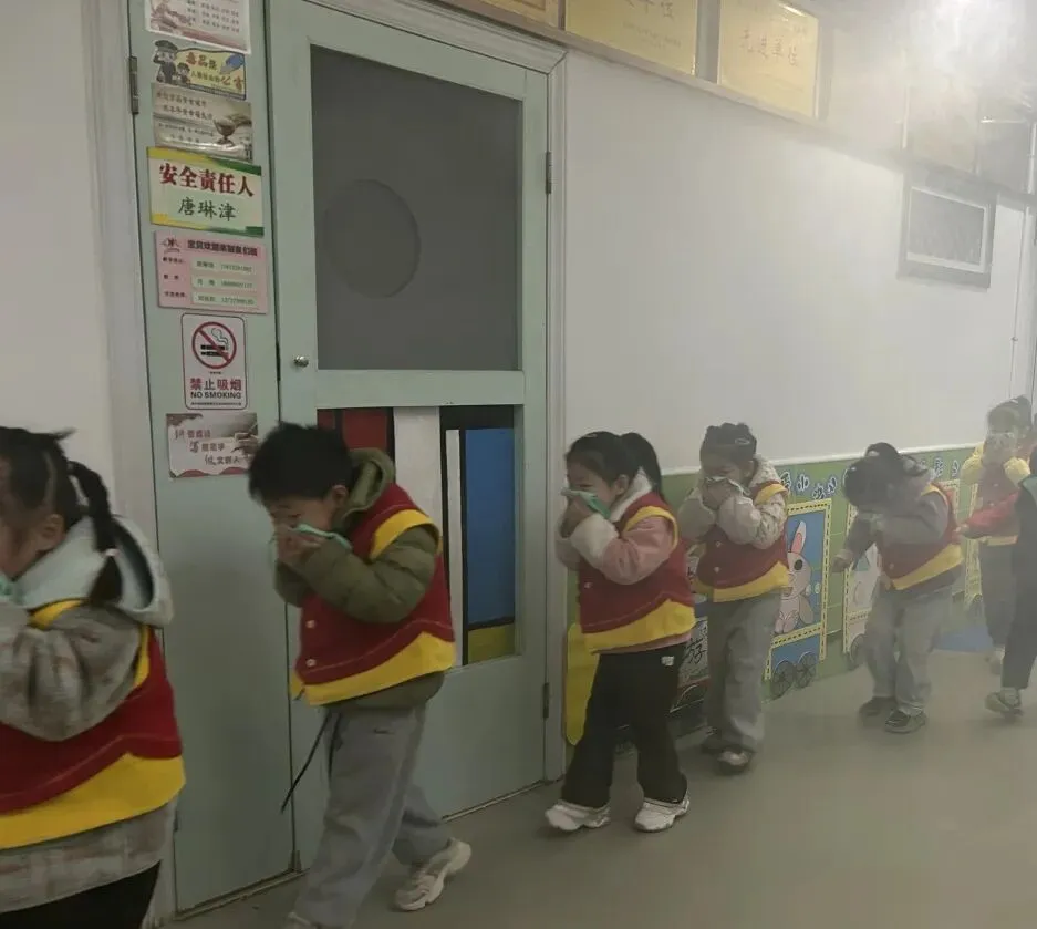 在老师的引导下,孩子们认真学习如何正确使用湿毛巾捂住口鼻,反复练习弯腰低姿的逃生姿势,并熟悉班级疏散路线和安全集结地点。孩子们在体验与练习中逐渐明白了“不推挤、不慌张、弯腰捂鼻有序撤离”的重要性,安全的种子也在心中悄然萌芽。