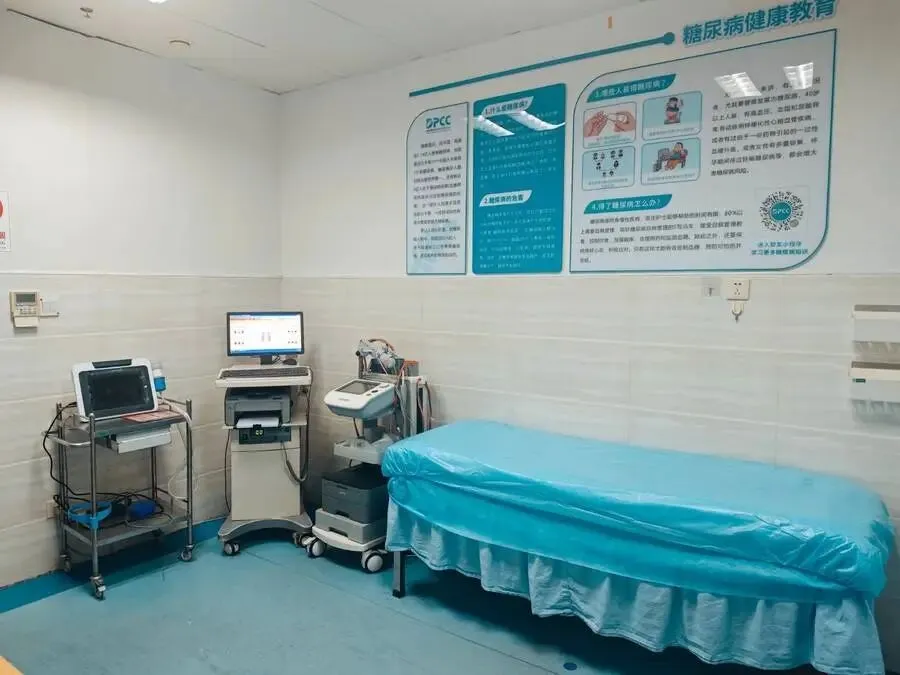 DPCC 糖尿病专病门诊配备专职医生 4 名、专职护士 3 名,门诊功能分区科学规范,涵盖大厅导诊区、登记与患者健康教育区(含休息区)、代谢检测区、门诊诊室(2 间)及检查室 1 间。可开展血糖、血酮、血压、身高体重、神经病变、踝肱指数、眼底照相、人体成分分析等多项检测项目。